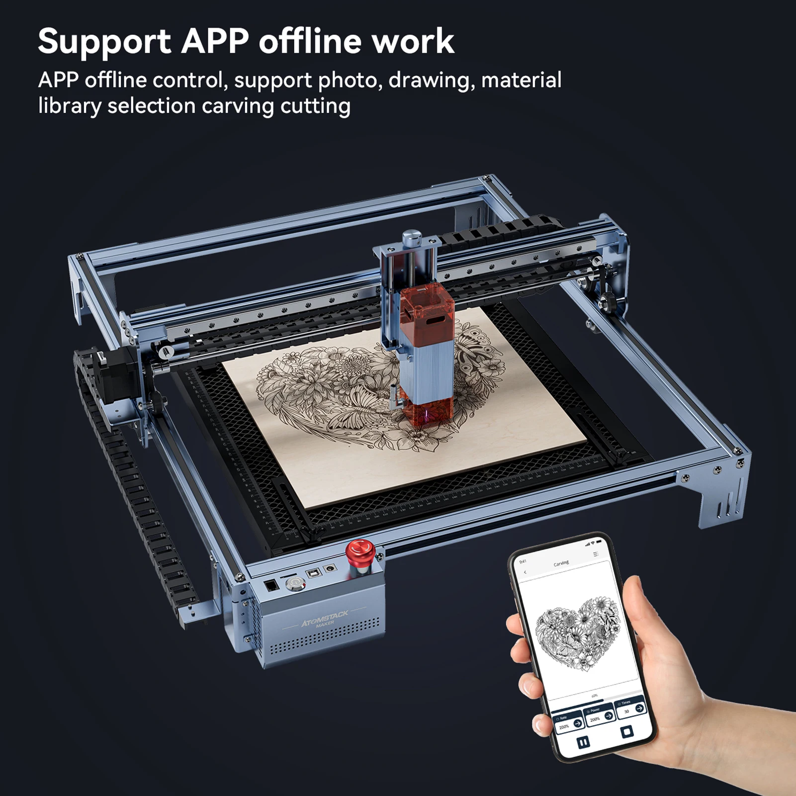 Le contr?le APP de deuxiõ¹me g¹Èn¹Èration: Adopte le contr?le APP de deuxiõ¹me g¹Èn¹Èration, y compris la bibliothõ¹que de mat¹Èriaux de modõ¹le de coupe, des fonctions de conception riches et un contr?le de connexion stable. Cette conception permet aux utilisateurs d'utiliser la machine de d¹Ècoupe laser plus commod¹Èment, am¹Èliorant l'efficacit¹È du travail et la qualit¹È de coupe.