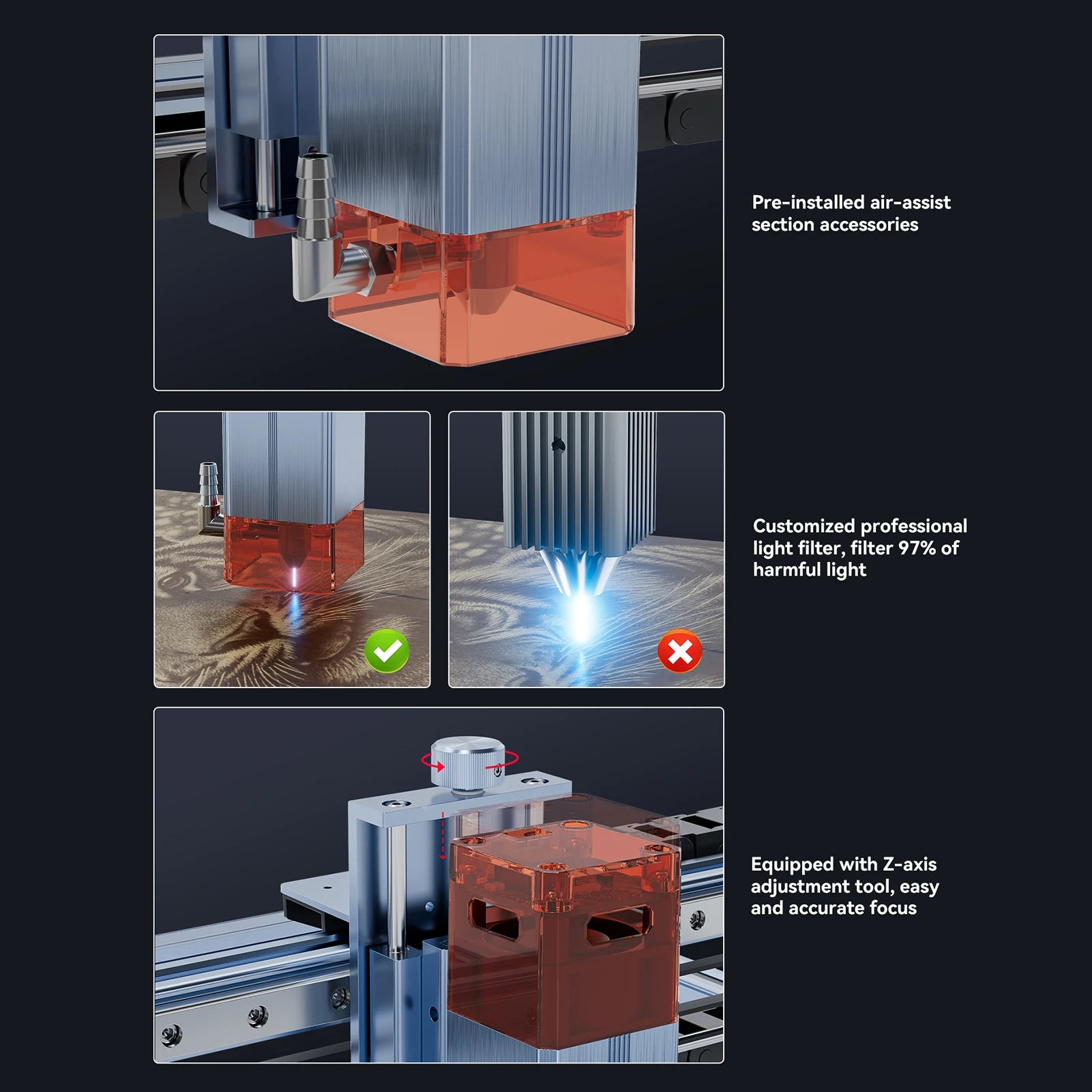 Vis int¹Ègrale: La machine utilise une vis int¹Ègr¹Èe au lieu d'un connecteur d'arbre combin¹È, le moteur pas ½Ç pas et la vis sont int¹Ègr¹Ès, ce qui rend le mouvement du laser plus pr¹Ècis et le couplage plus durable.