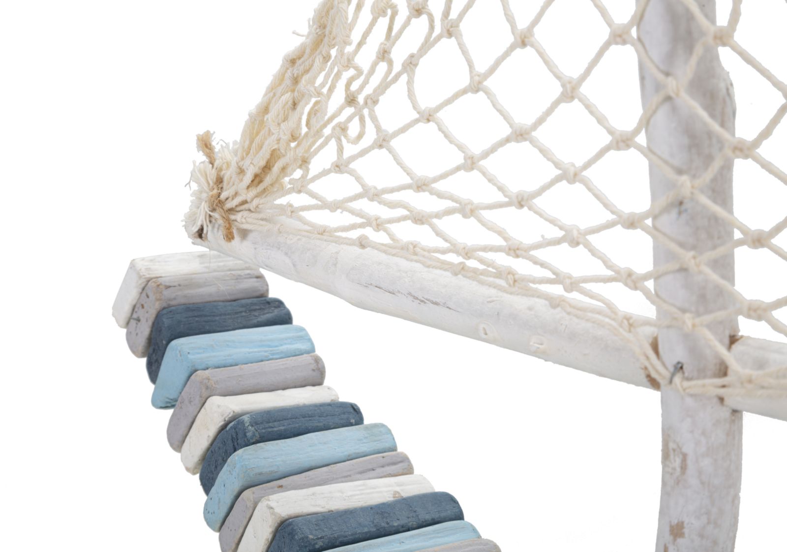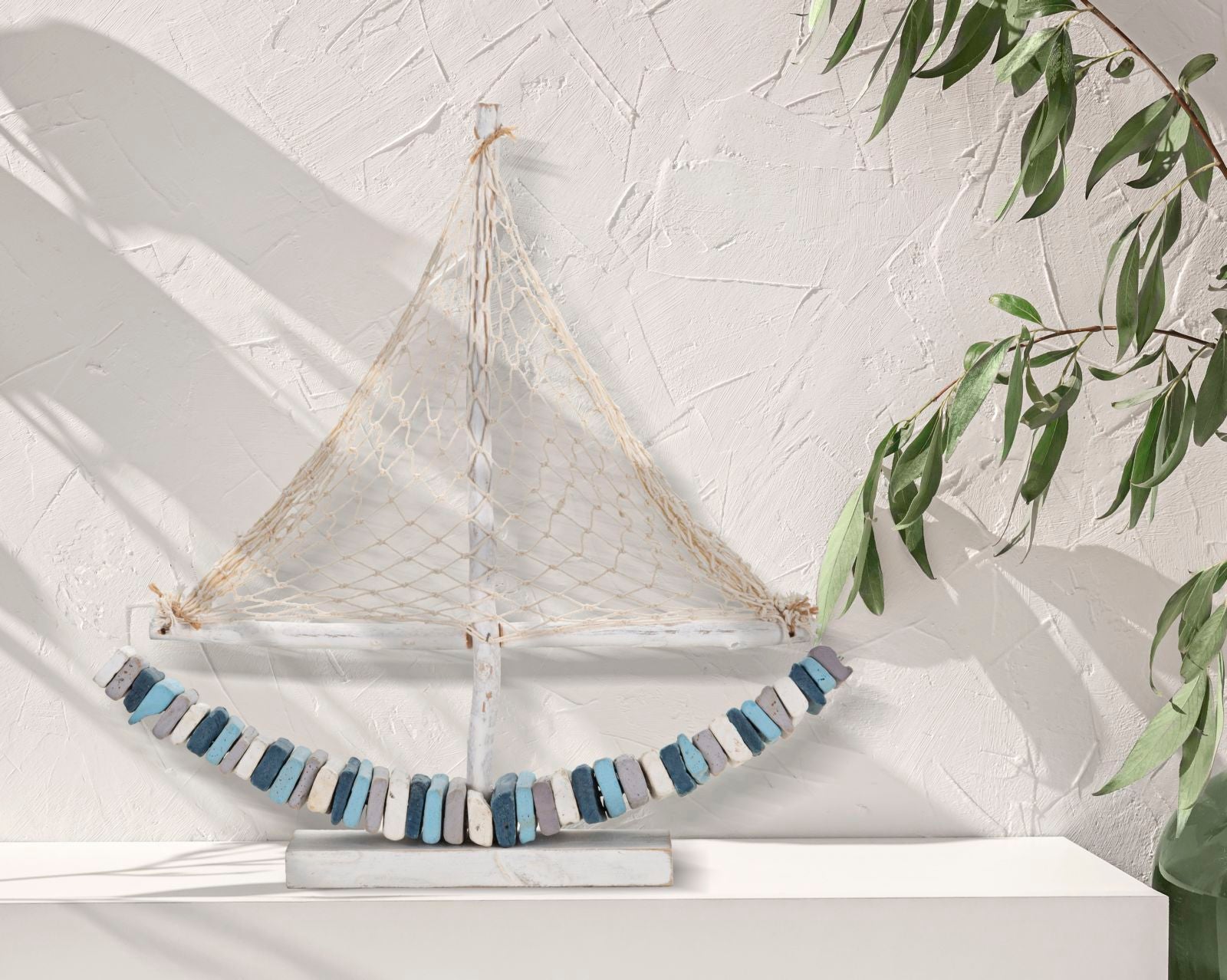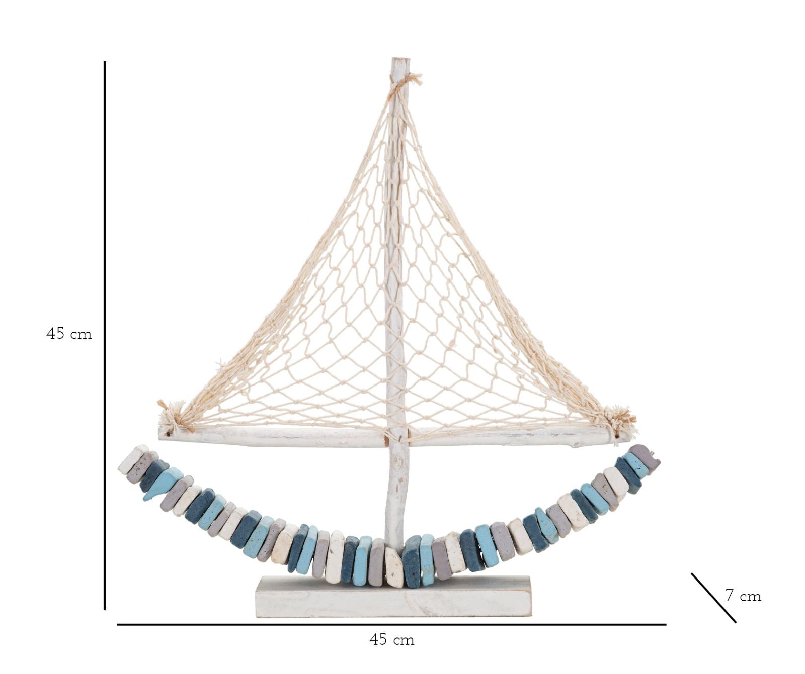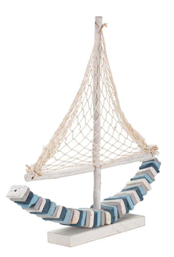 Scultura di barca a vela in legno con base. La vela ¨¨ realizzata con una rete in tessuto mentre lo scafo ¨¨ realizzato con piccoli tasselli di legno.