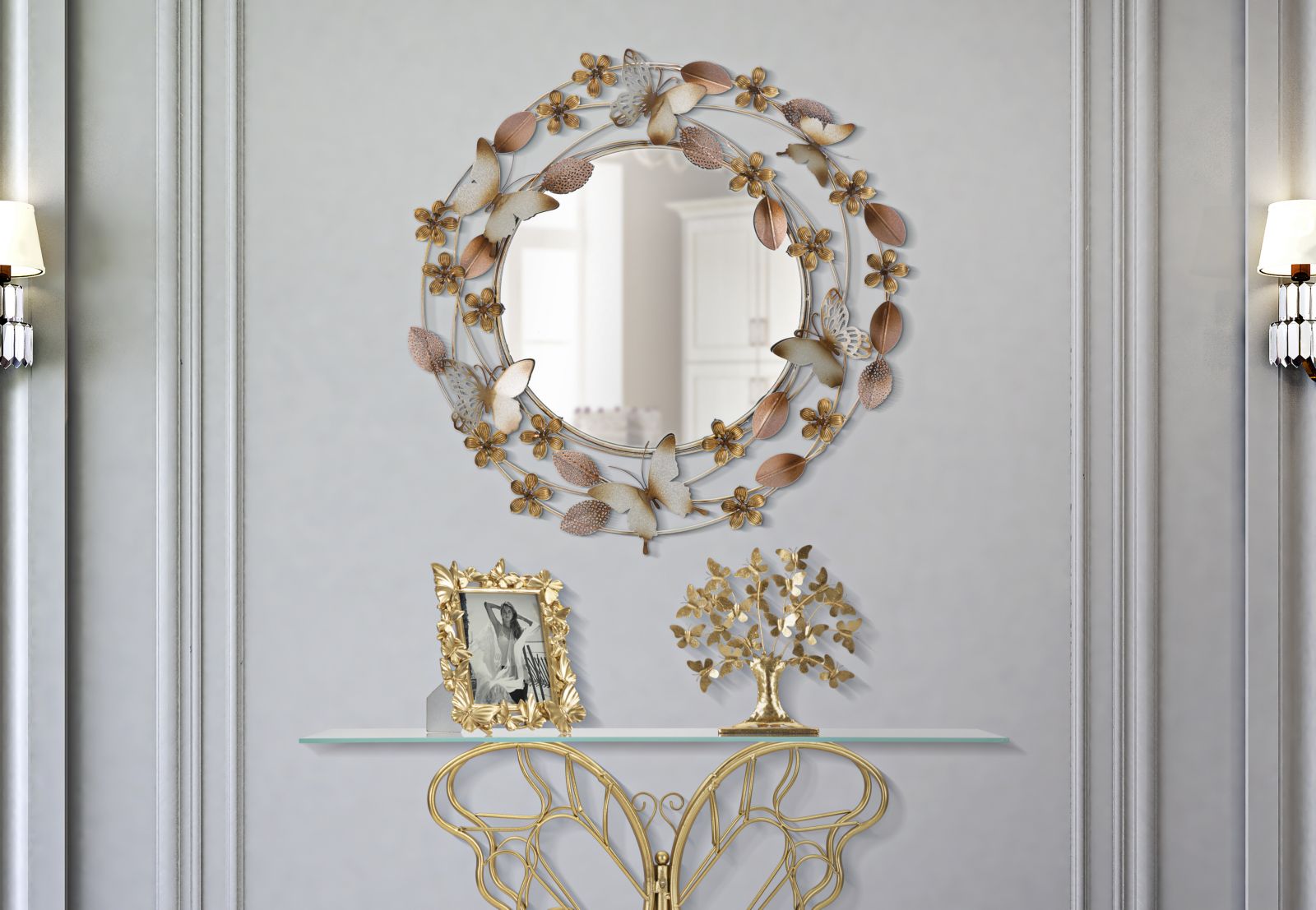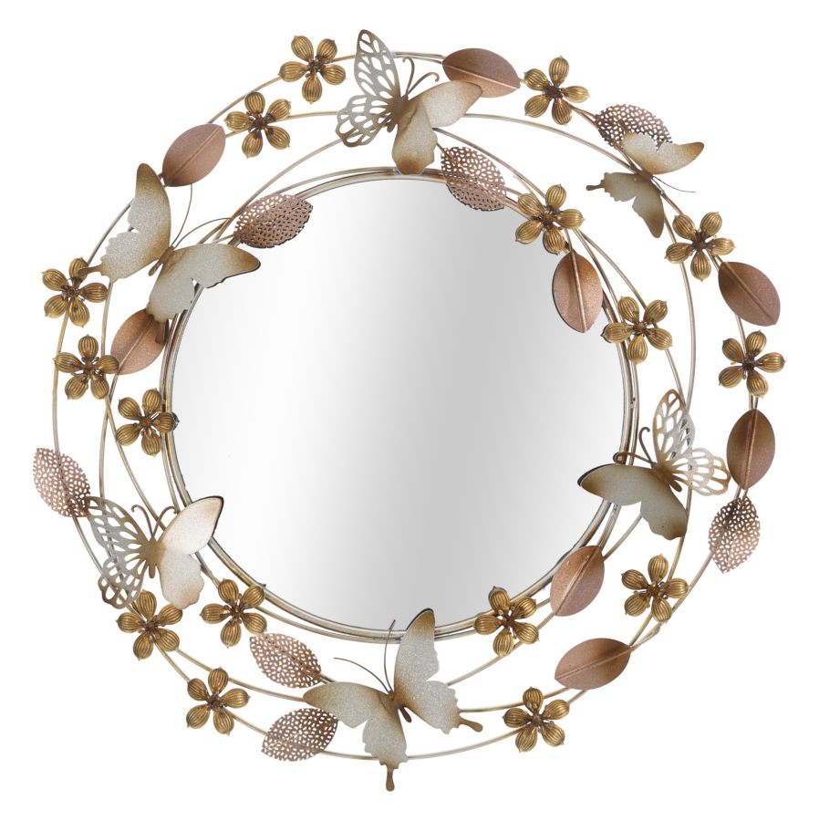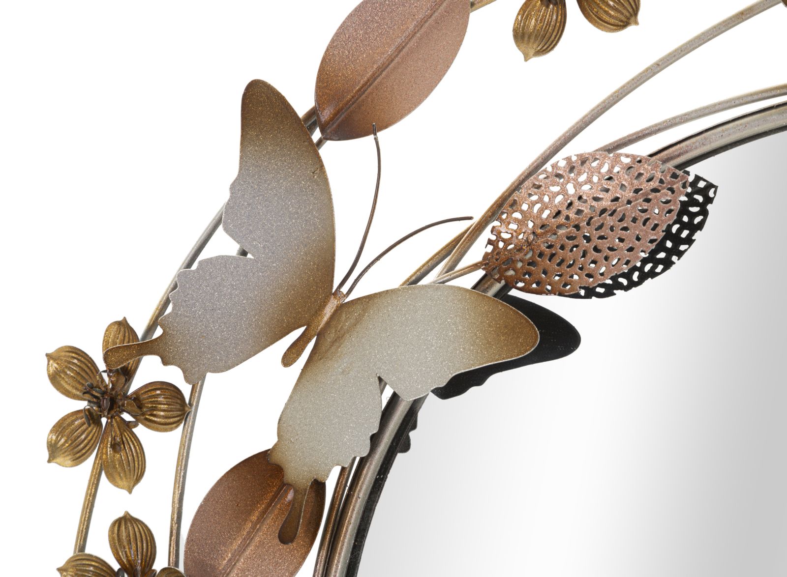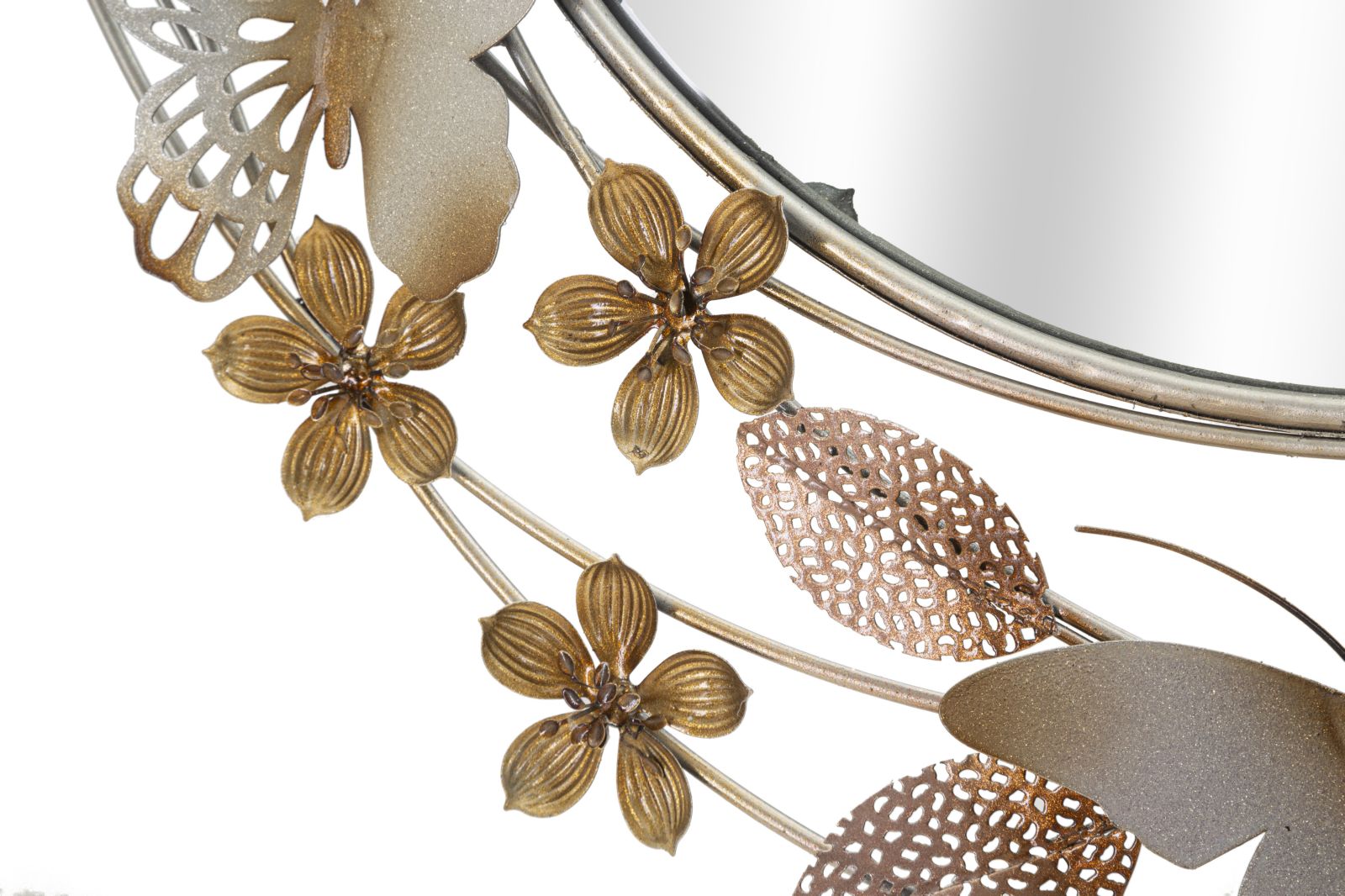 Specchio rotondo da parete con la cornice composta da un vortice di fiori, foglie e farfalle multicolori