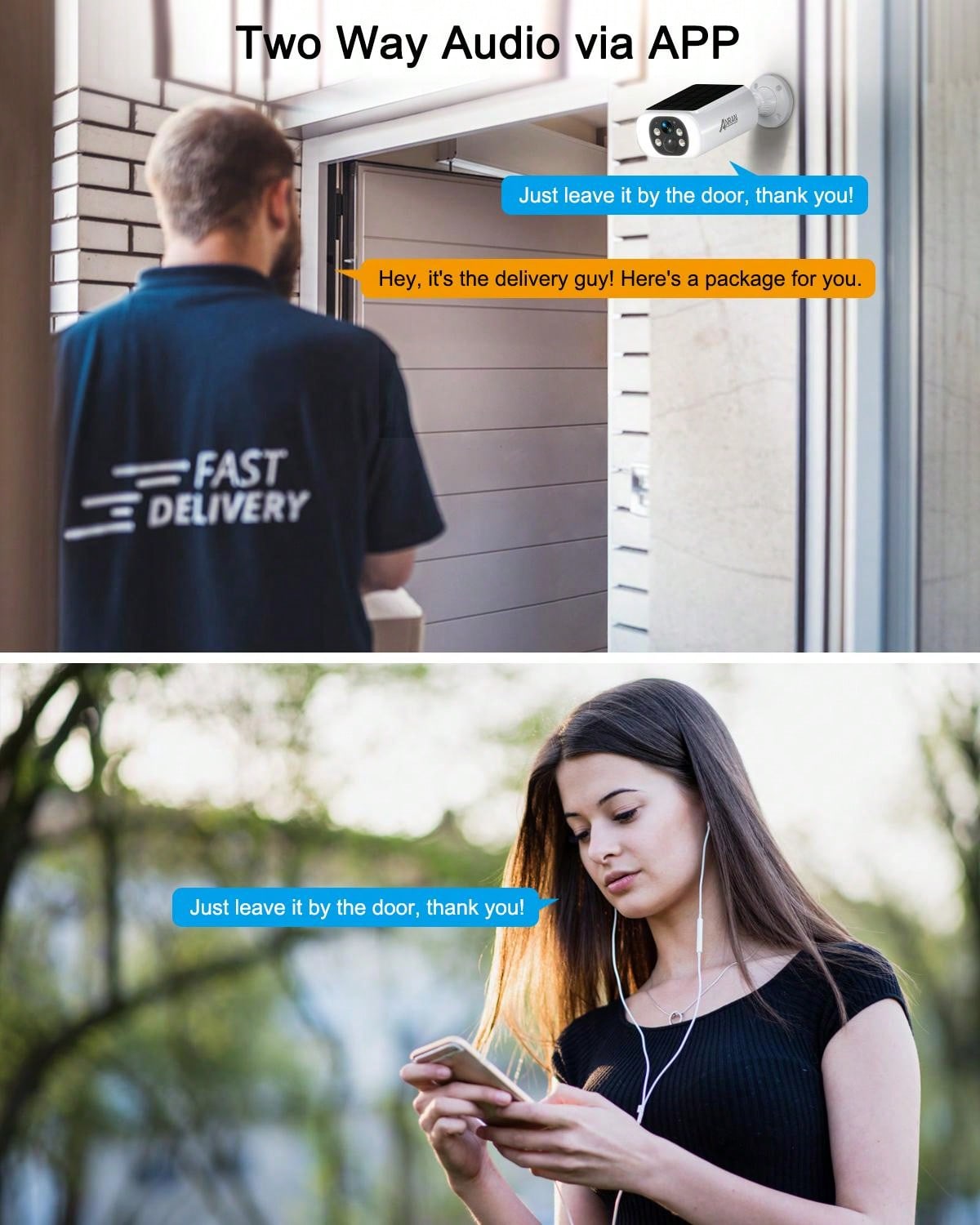 Audio bidirectionnel et r¨¦sistant aux intemp¨¦ries IP67 ------ Cette cam¨¦ra ext¨¦rieure dispose d'un microphone et d'un haut-parleur int¨¦gr¨¦s qui prennent en charge les appels audio bidirectionnels en temps r¨¦el. Avec l'application mobile, vous pouvez avertir les voleurs, filtrer les visiteurs ¨¤ votre porte ou communiquer directement avec votre famille ou vos amis. IP65 r¨¦sistant aux intemp¨¦ries peut ¨ºtre utilis¨¦ dans des conditions m¨¦t¨¦orologiques extr¨ºmes.