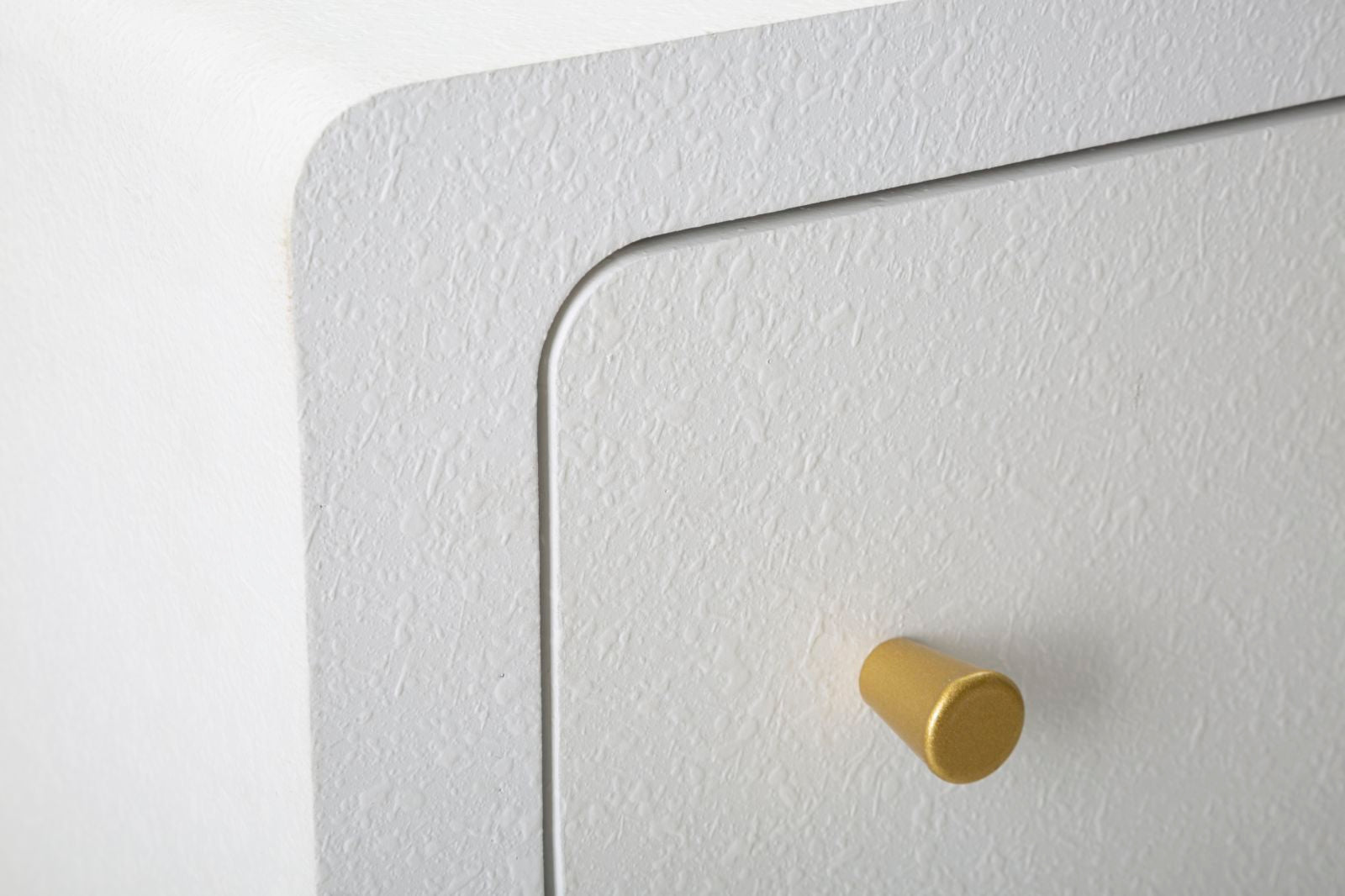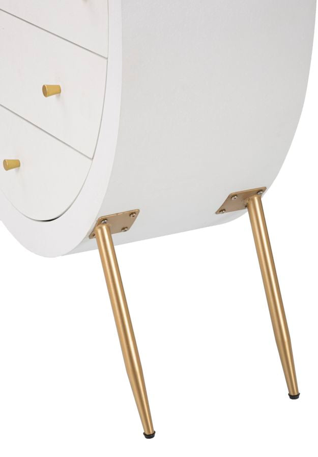 Com¨° in legno bianco dalle linee arrotondate che richiamano il modernariato degli anni '70. Completo di 3 cassetti. Gambe in metallo dorato da assemblare.
