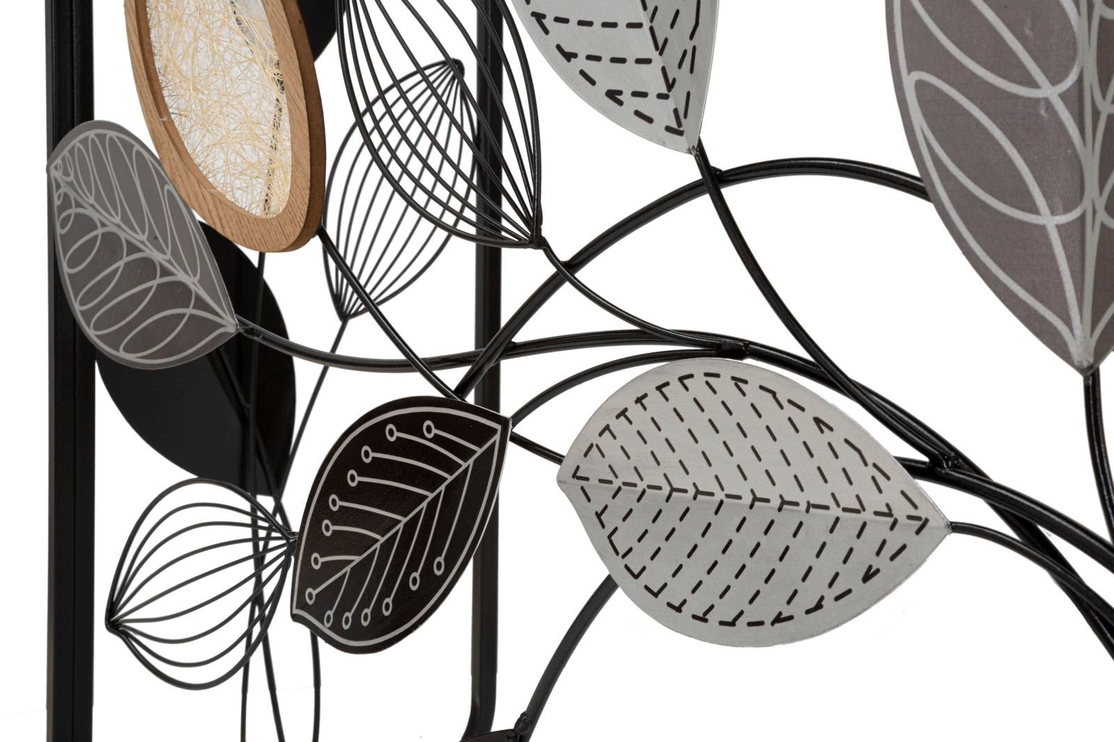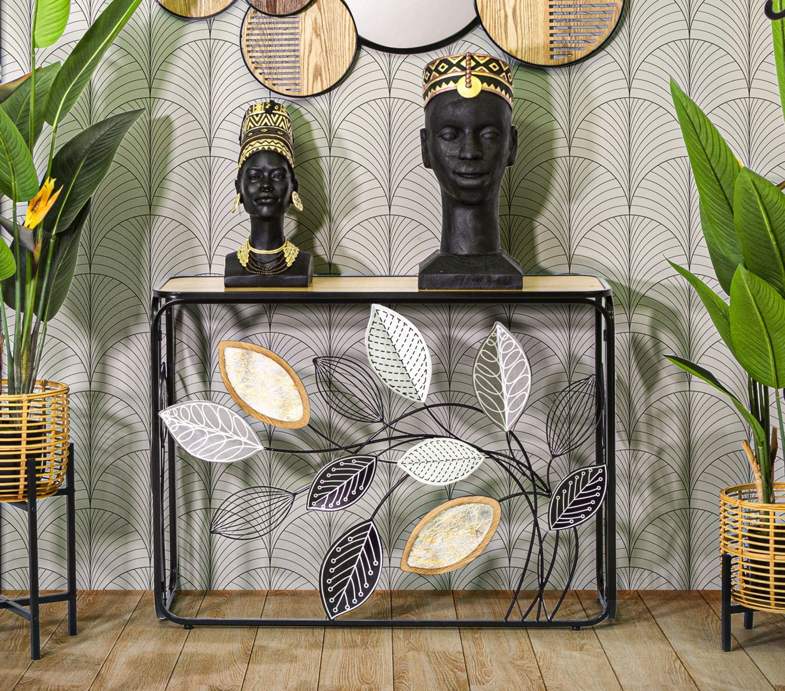 Console rettangolare in metallo nero con foglie decorative e piano in legno marrone.