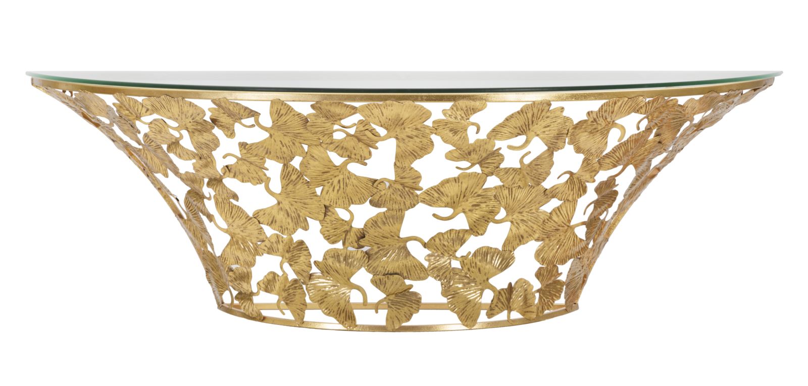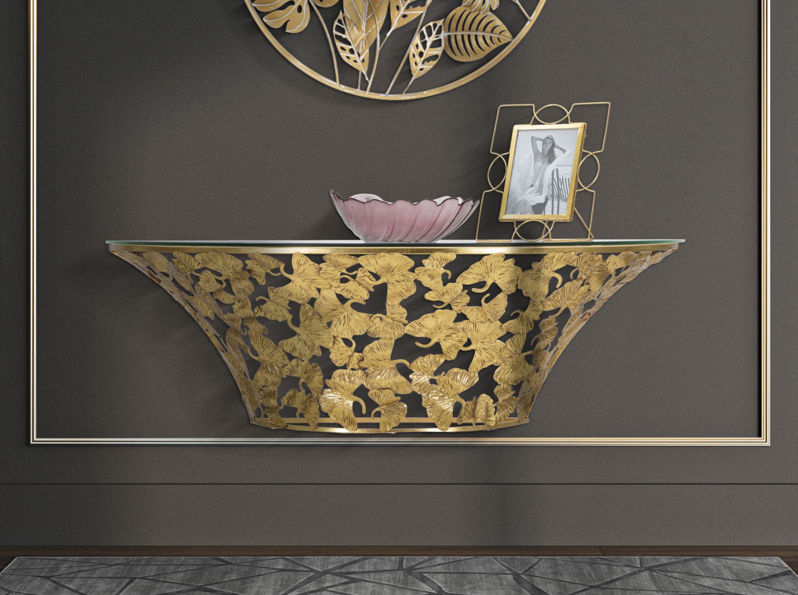 Console semicircolare da parete in metallo dorato con piano in vetro. La base ¨¨ riccamente decorata da foglie. Il particolare design dona un tocco di classe e relax ad ogni ambiente.