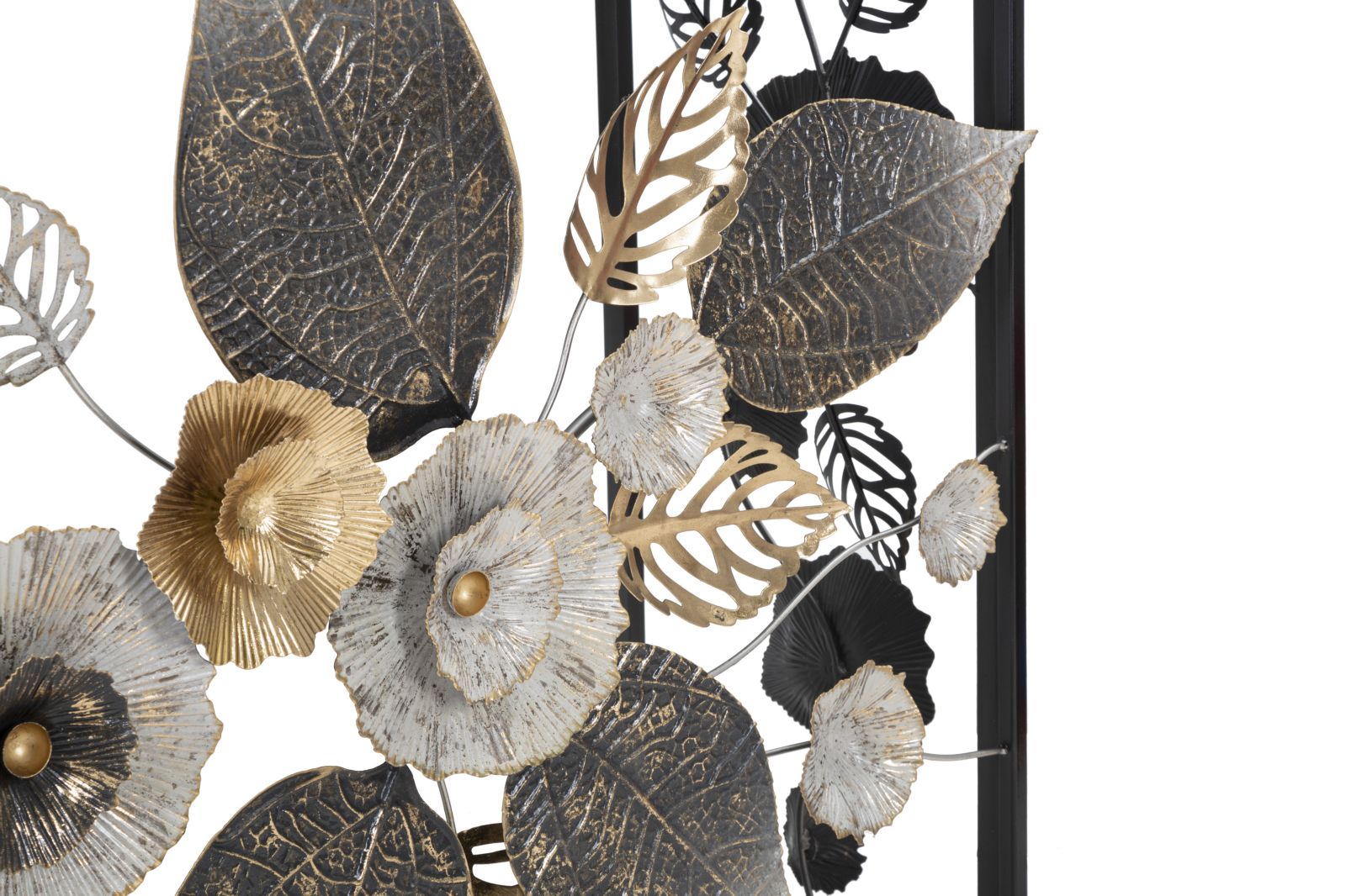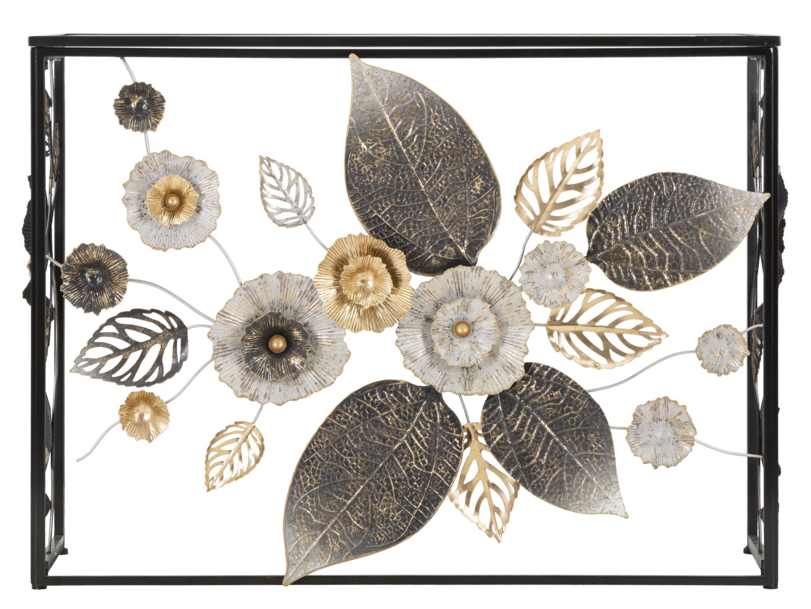 Console in metallo nero con piano in vetro a specchio. La struttura ¨¨ decorata da foglie e fiori su tutti i lati. Il particolare design e la semplicit¨¤ delle linee della struttura donano un tocco di classe ed eleganza ad ogni ambiente.
