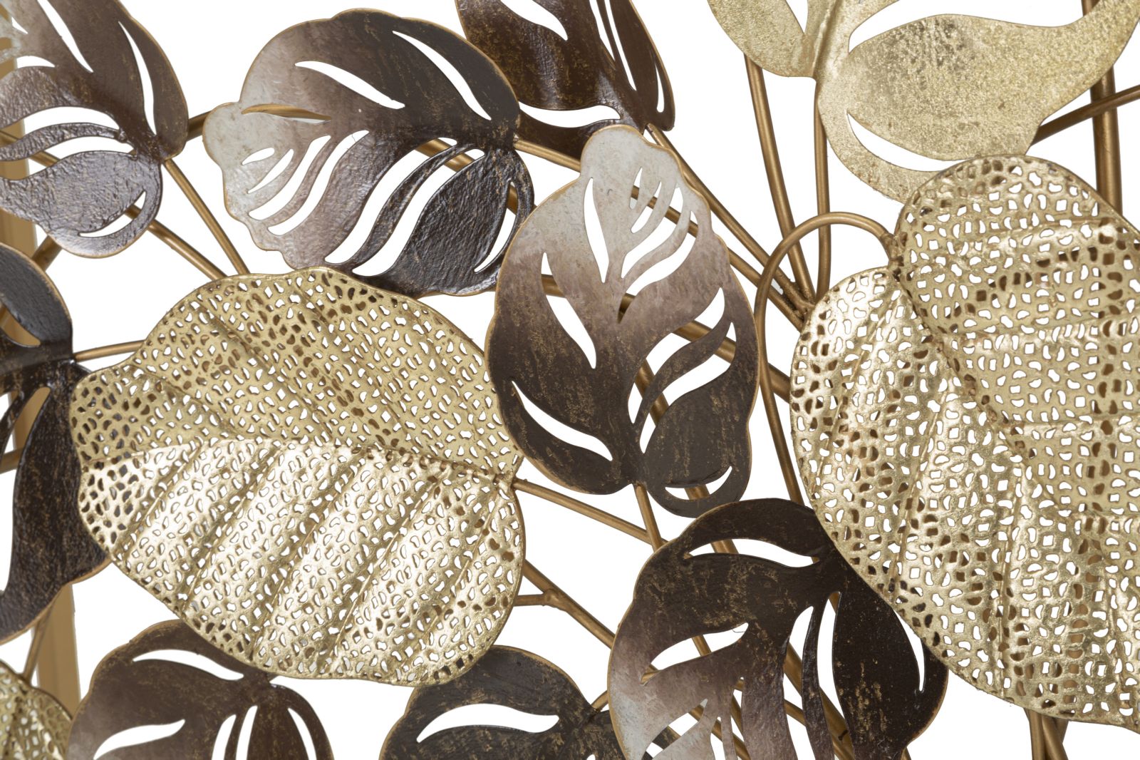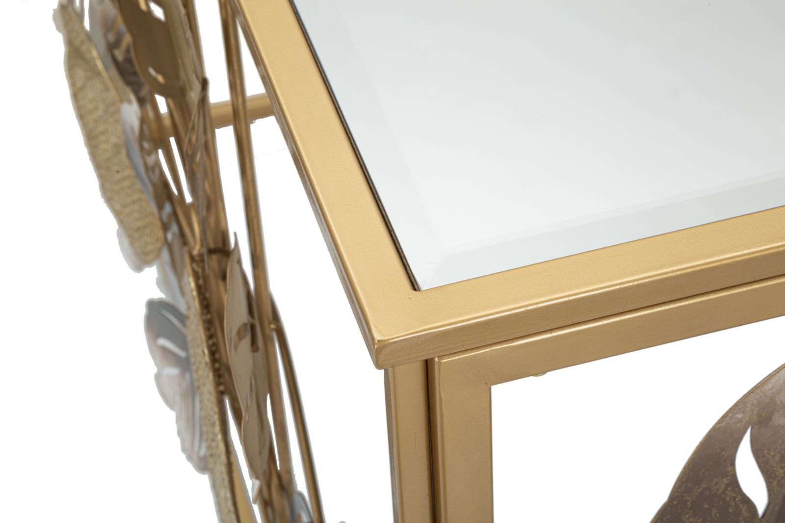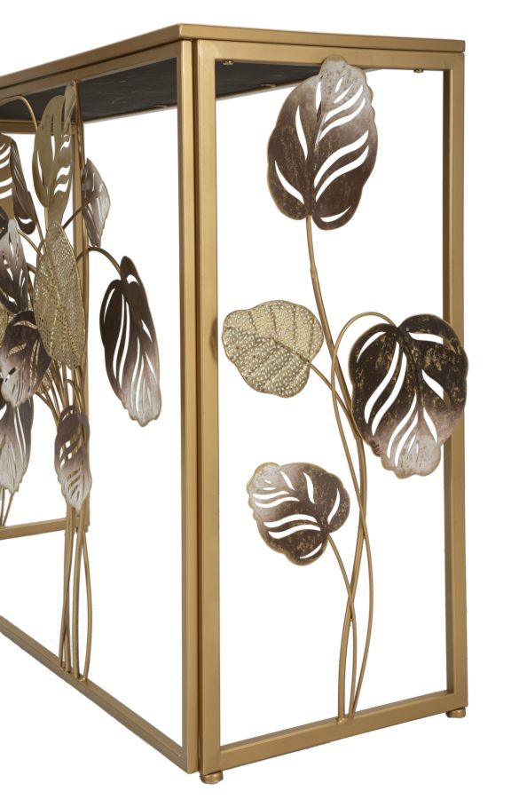 Console rettangolare in metallo dorato con foglie decorative dorate e dai colori caldi e piano in vetro a specchio.