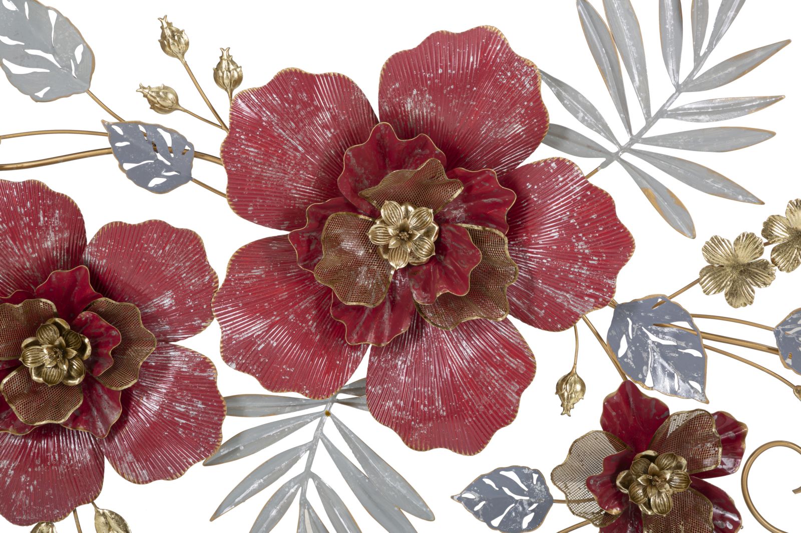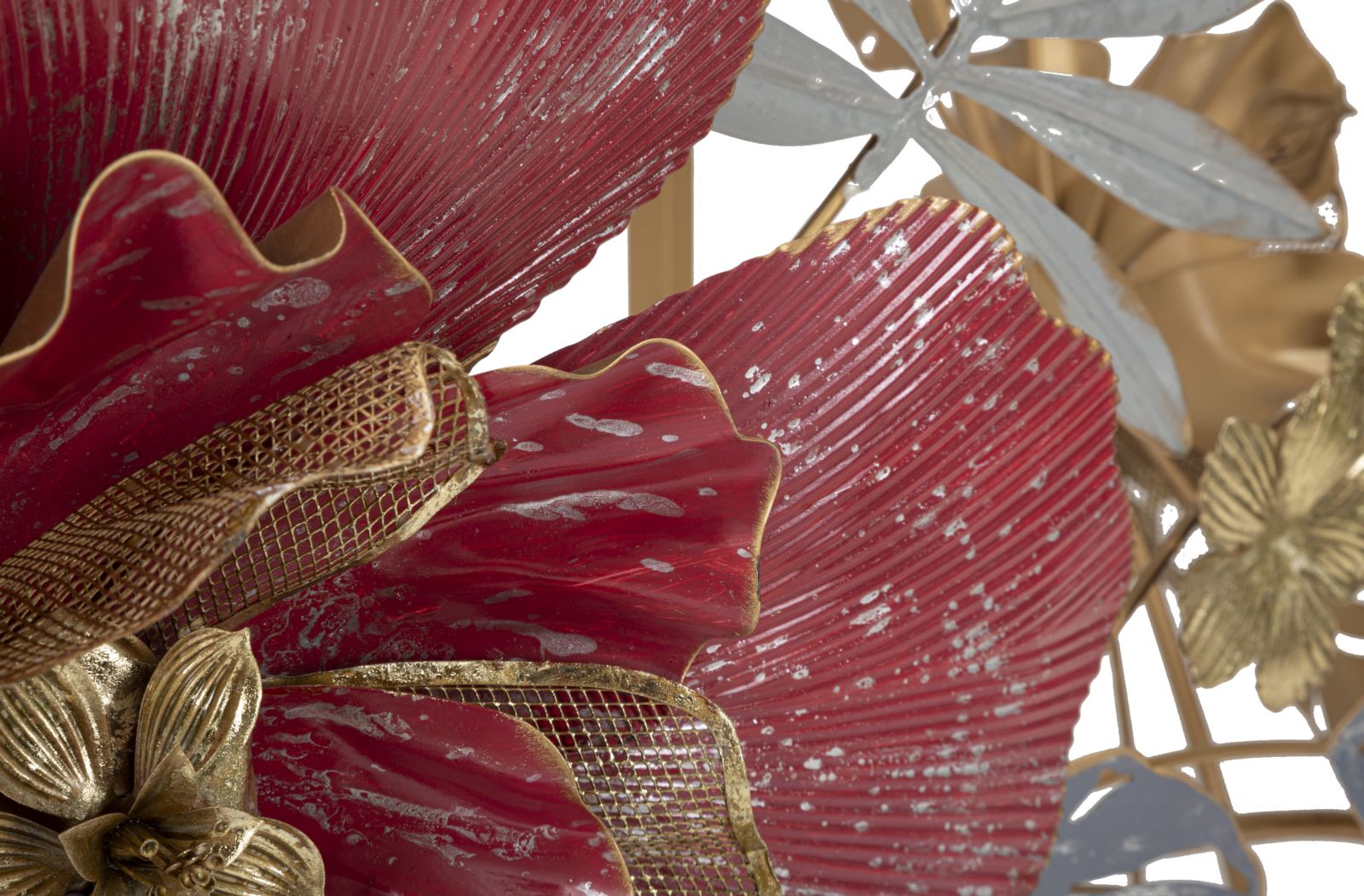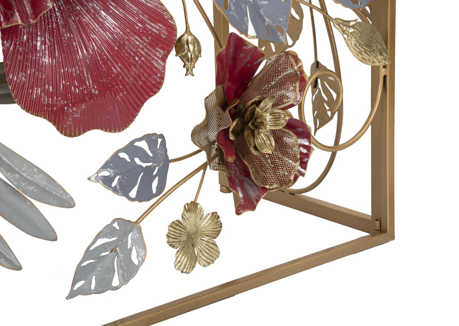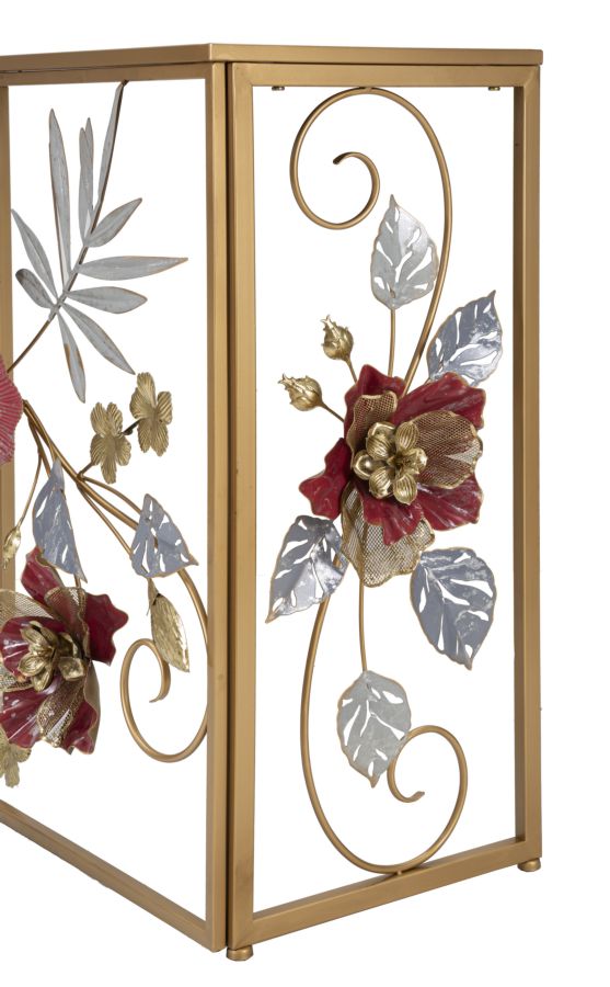 Console rettangolare in metallo dorato con foglie e fiori dai colori accesi decorativi e piano in vetro a specchio.