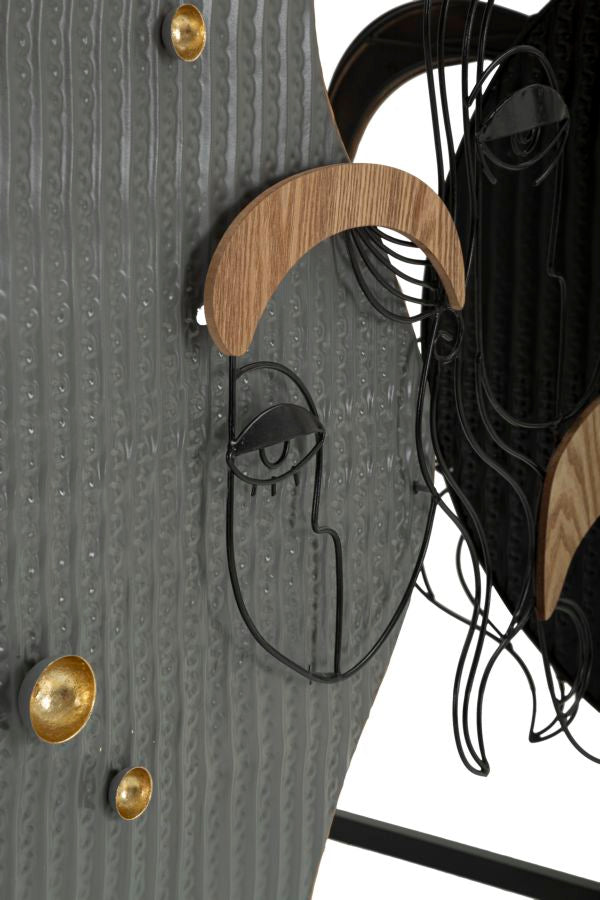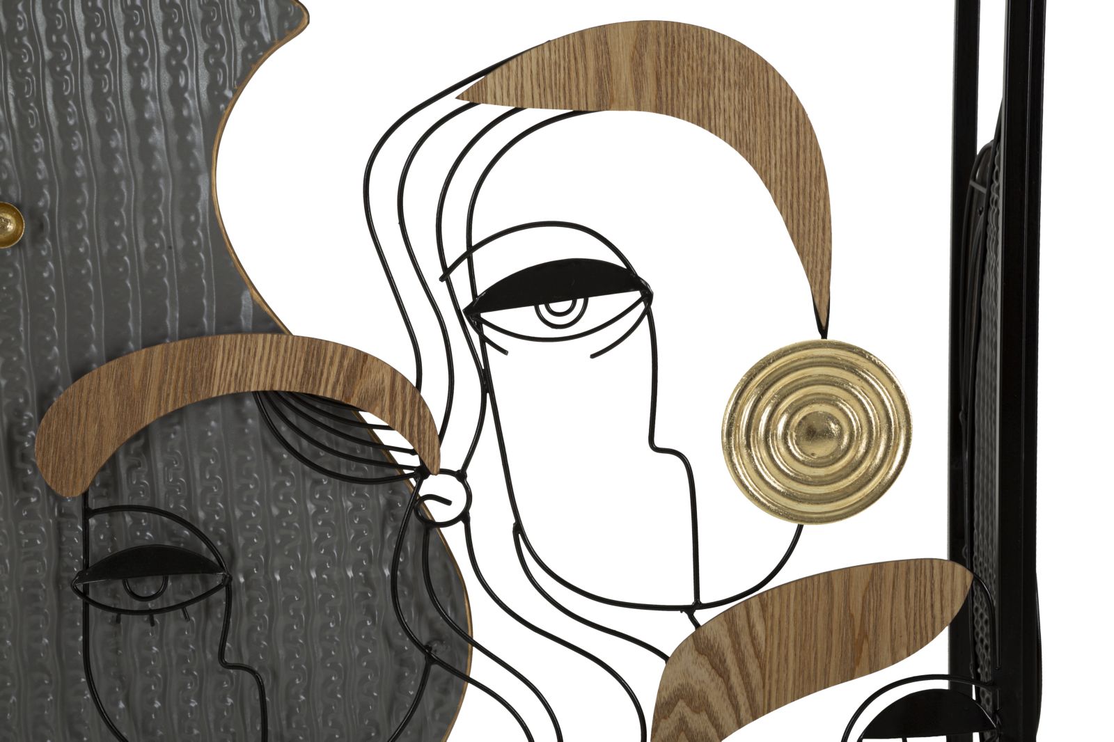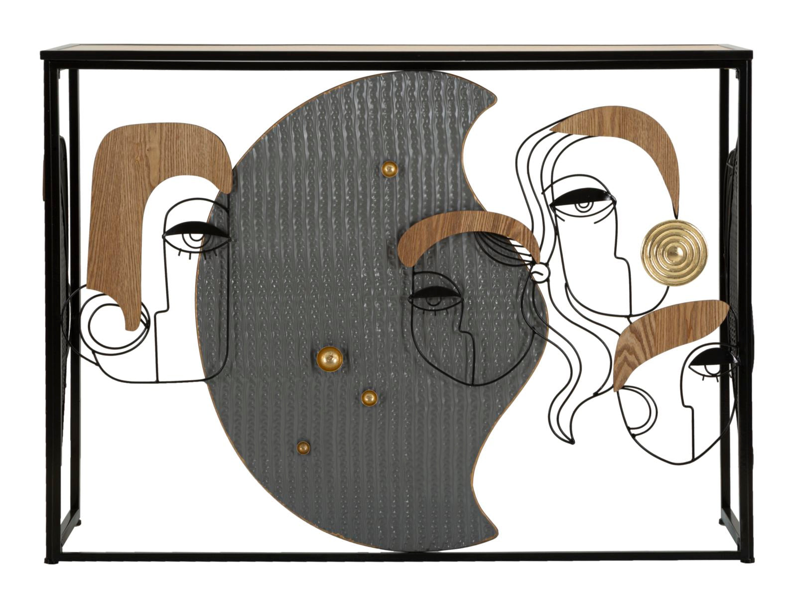 Console in metallo con piano in legno elegantemente decorata da figure che richiamano il cubismo. Prodotto da assemblare.