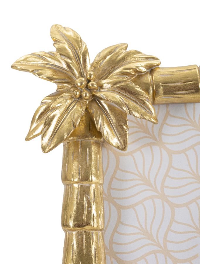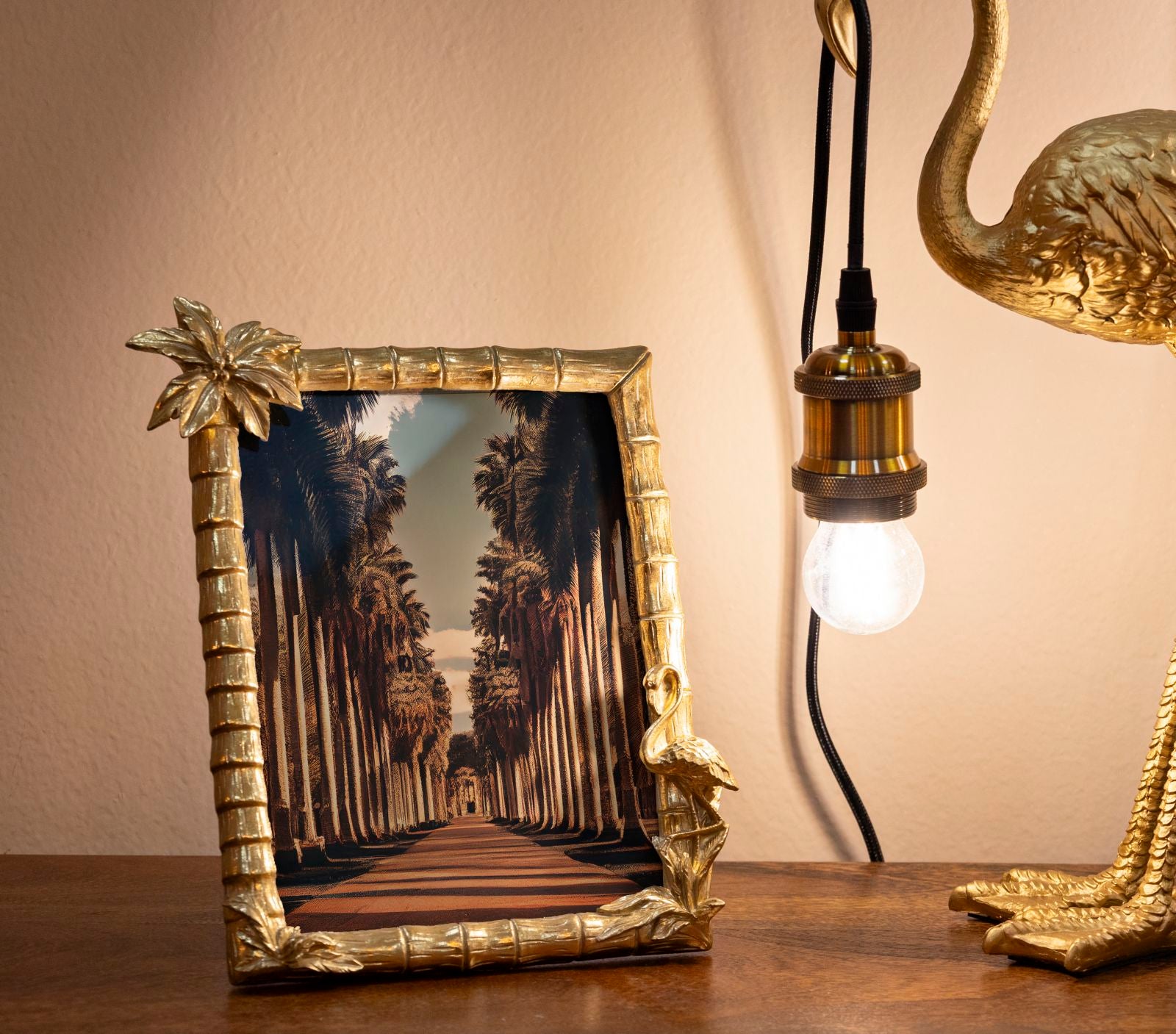 Cornice rettangolare da appoggio in resina dal design che ricorda le canne di bamboo e improziosita da un fiore e un fenicottero. Dimensioni foto cm 15x20.
