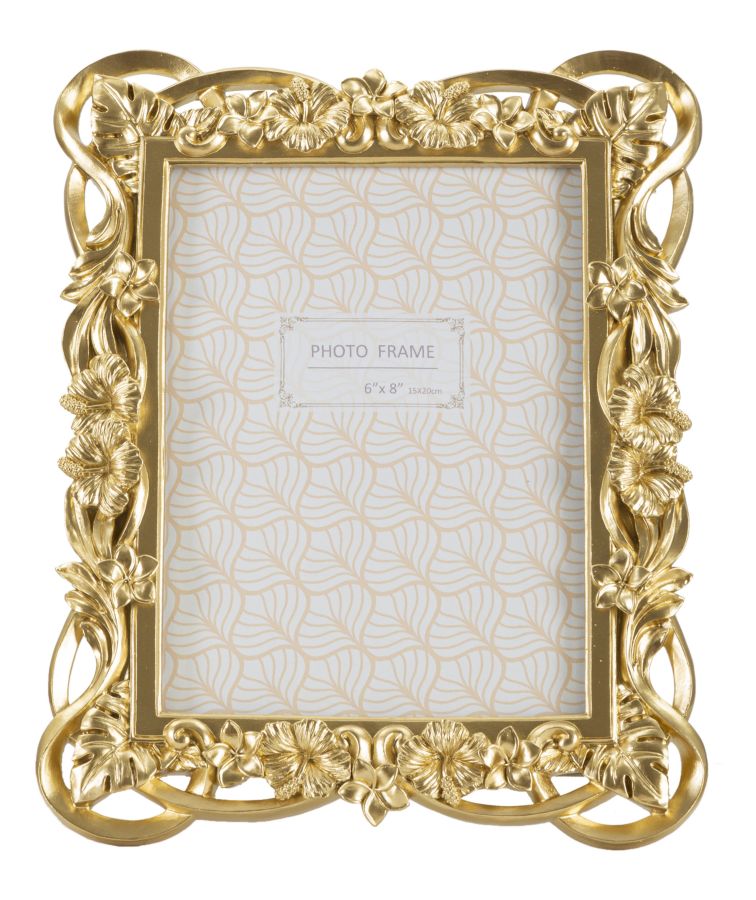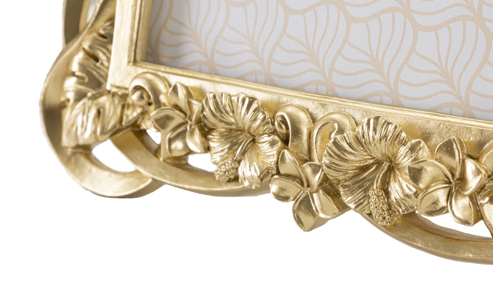 Cornice rettangolare da appoggio in resina dal design composto da un insieme di fiori e foglie. Pu¨° essere posizionata sia in orizzontale che in verticale. Dimensioni foto cm 15x20.
