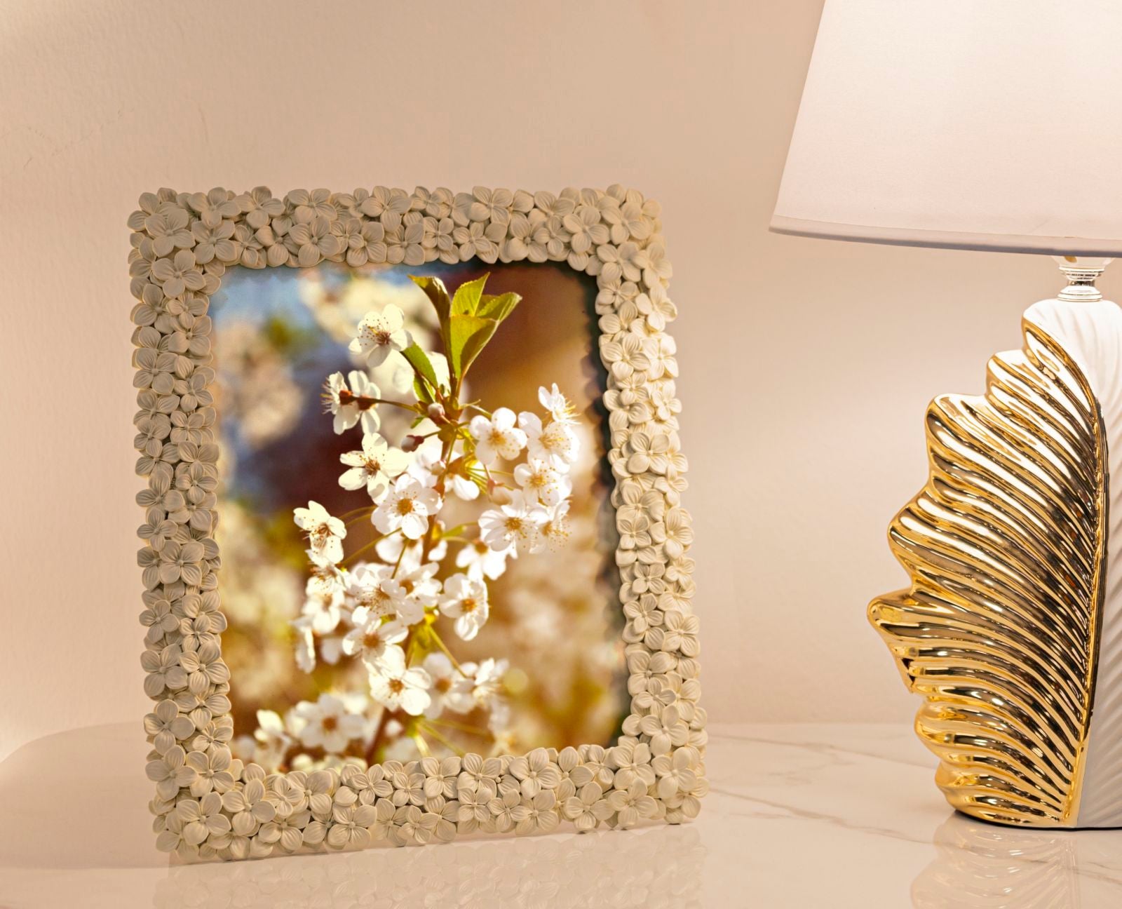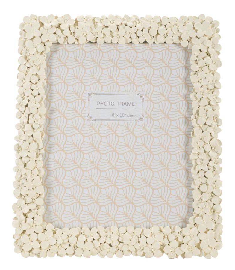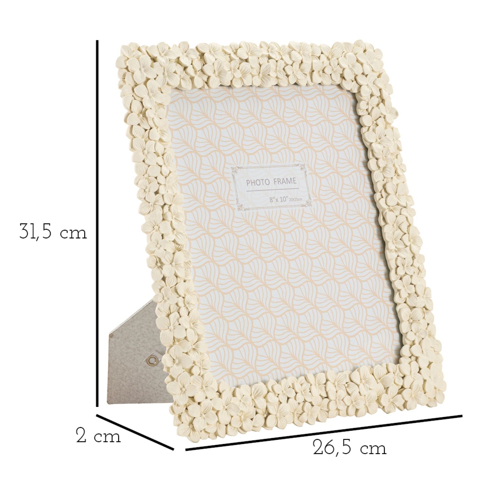 Cornice rettangolare da appoggio in resina dal design composto da un insieme di fiorellini. Pu¨° essere posizionata sia in orizzontale che in verticale. Dimensioni foto cm 20x25.