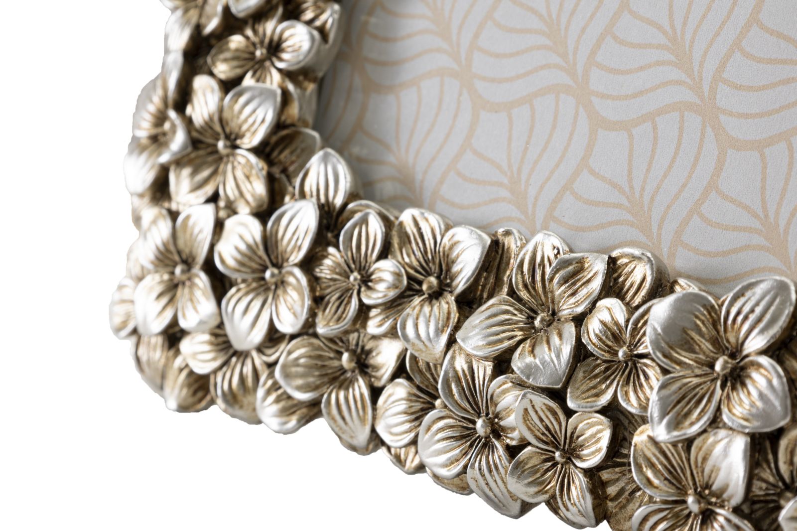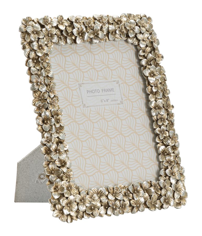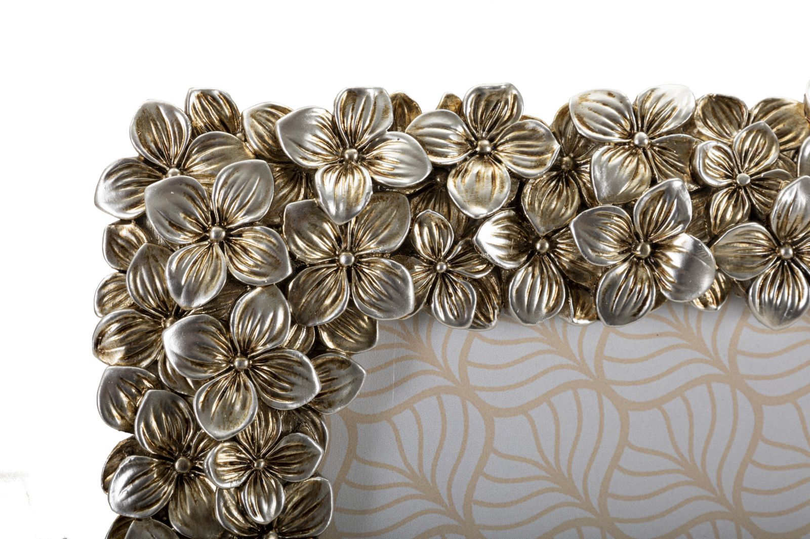 Cornice rettangolare da appoggio in resina dal design composto da un insieme di fiorellini. Pu¨° essere posizionata sia in orizzontale che in verticale. Dimensioni foto cm 15x20.