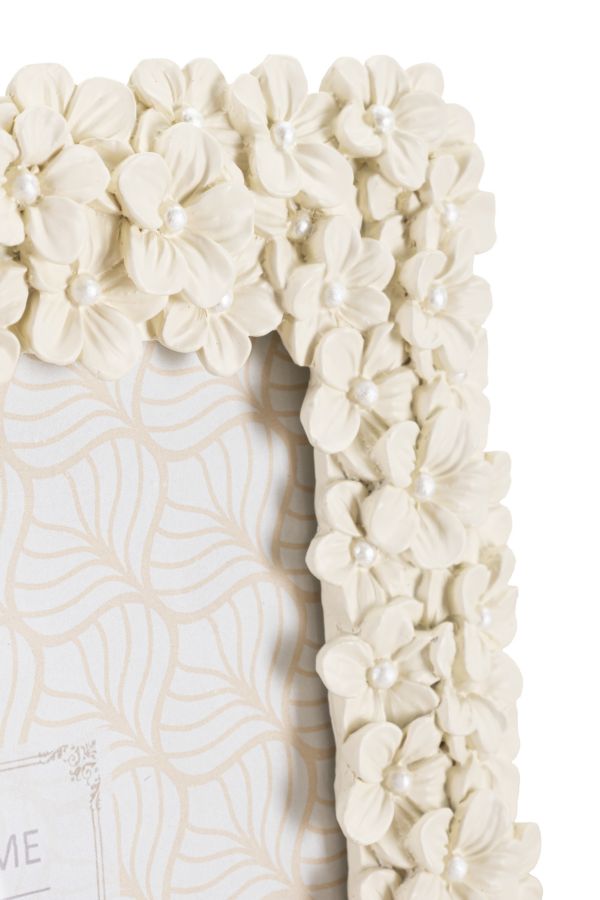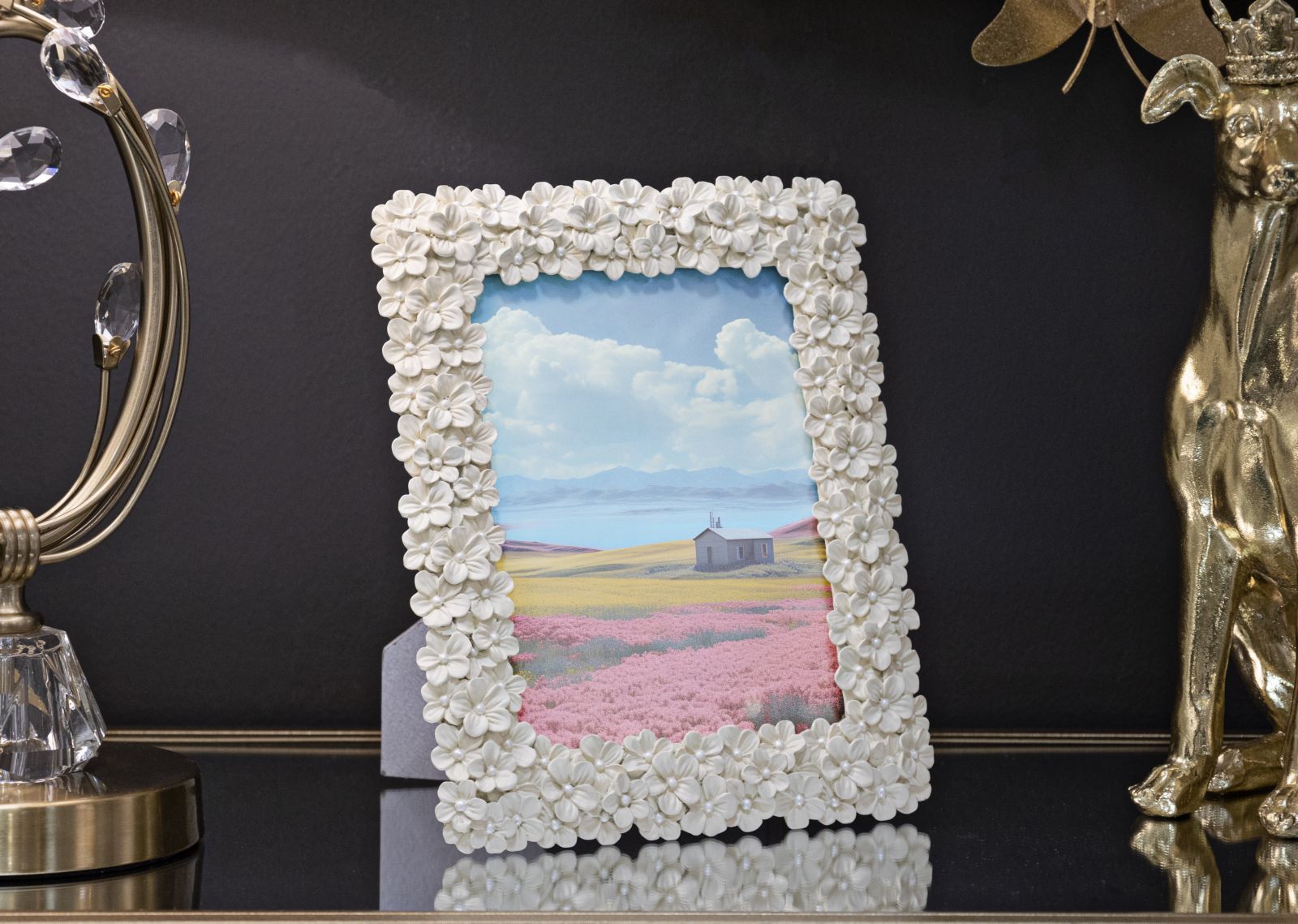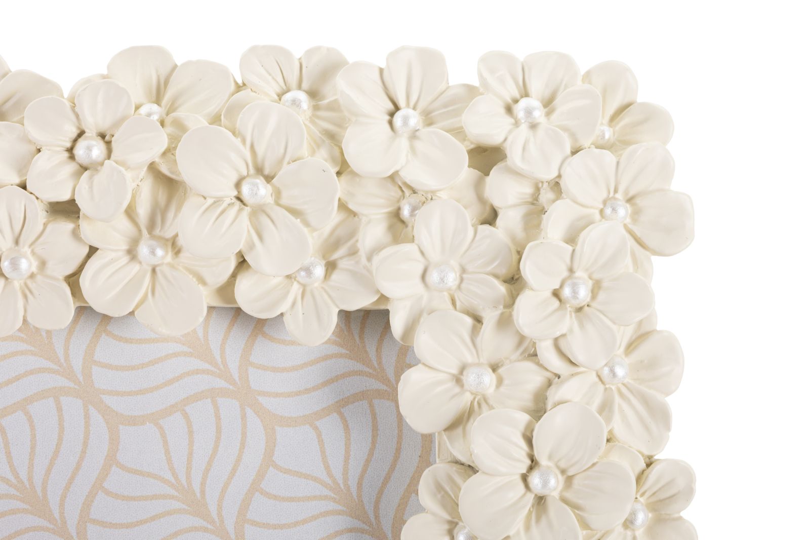 Cornice rettangolare da appoggio in resina realizzata da un insieme di fiorellini. Pu¨° essere posizionata sia in orizzontale che in verticale. Dimensioni foto cm 15x20.