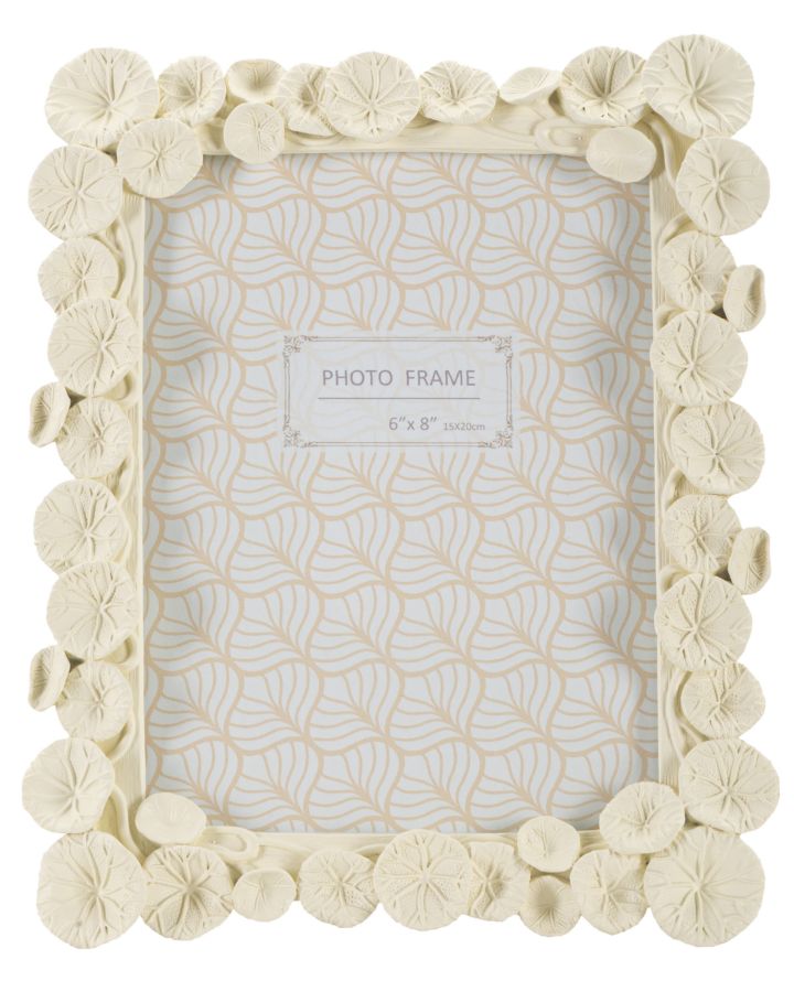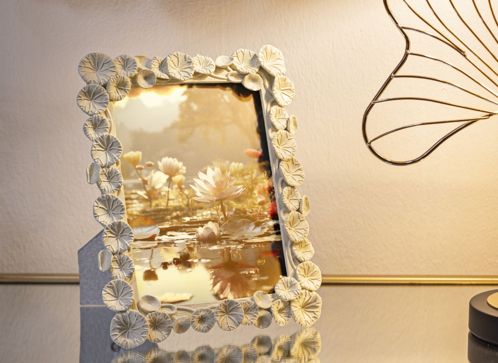 Cornice rettangolare da appoggio in resina impreziosita da un insieme di foglie di loto. Pu¨° essere posizionata sia in orizzontale che in verticale. Dimensioni foto cm 15x20.