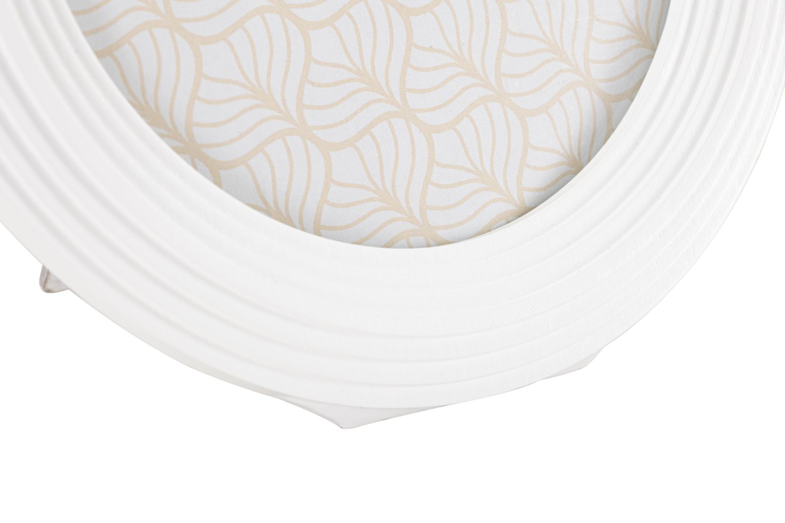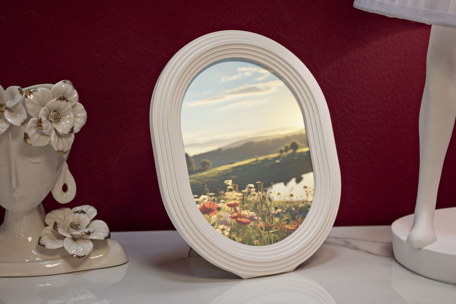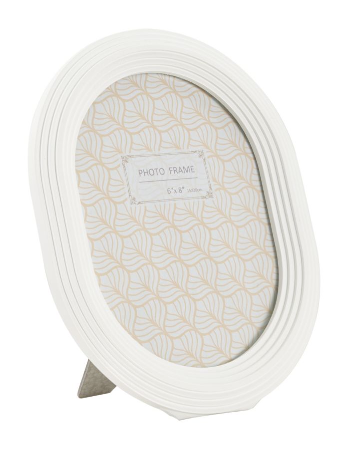Cornice ovale da appoggio in resina bianca dal design semplice e lineare. Dimensioni foto cm 15x20.