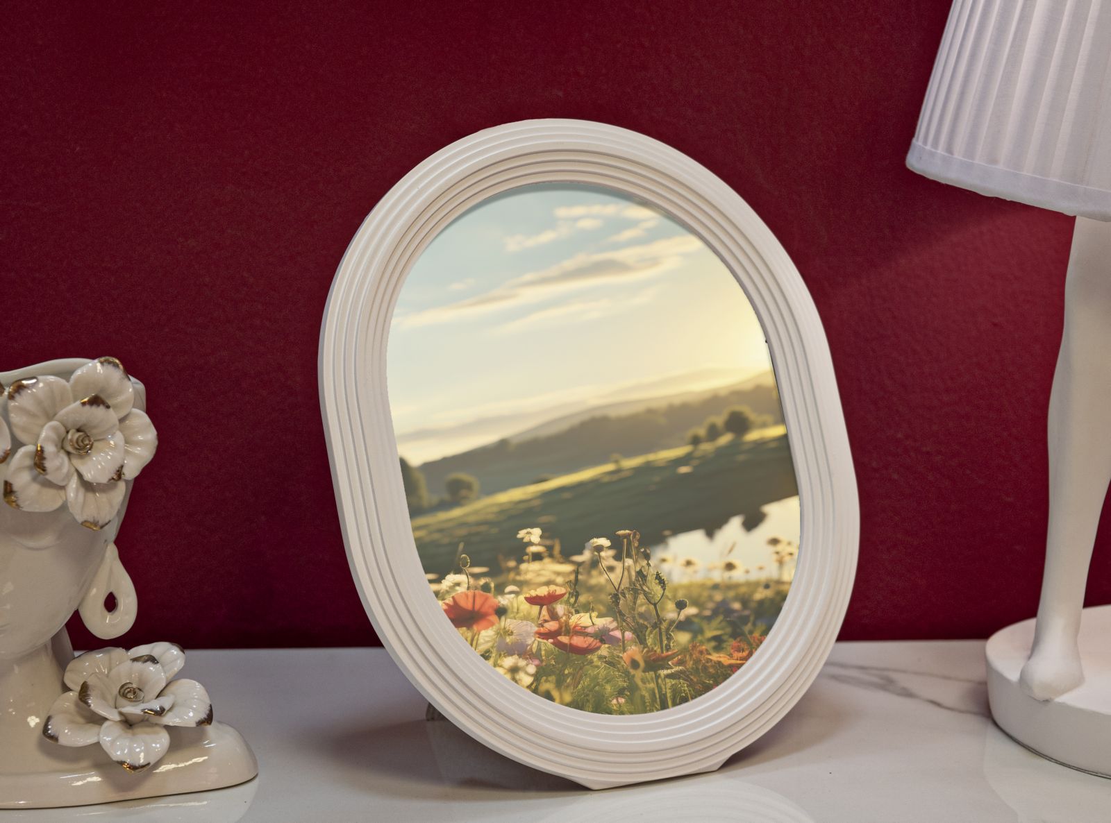Cornice ovale da appoggio in resina bianca dal design semplice e lineare. Dimensioni foto cm 20x25.