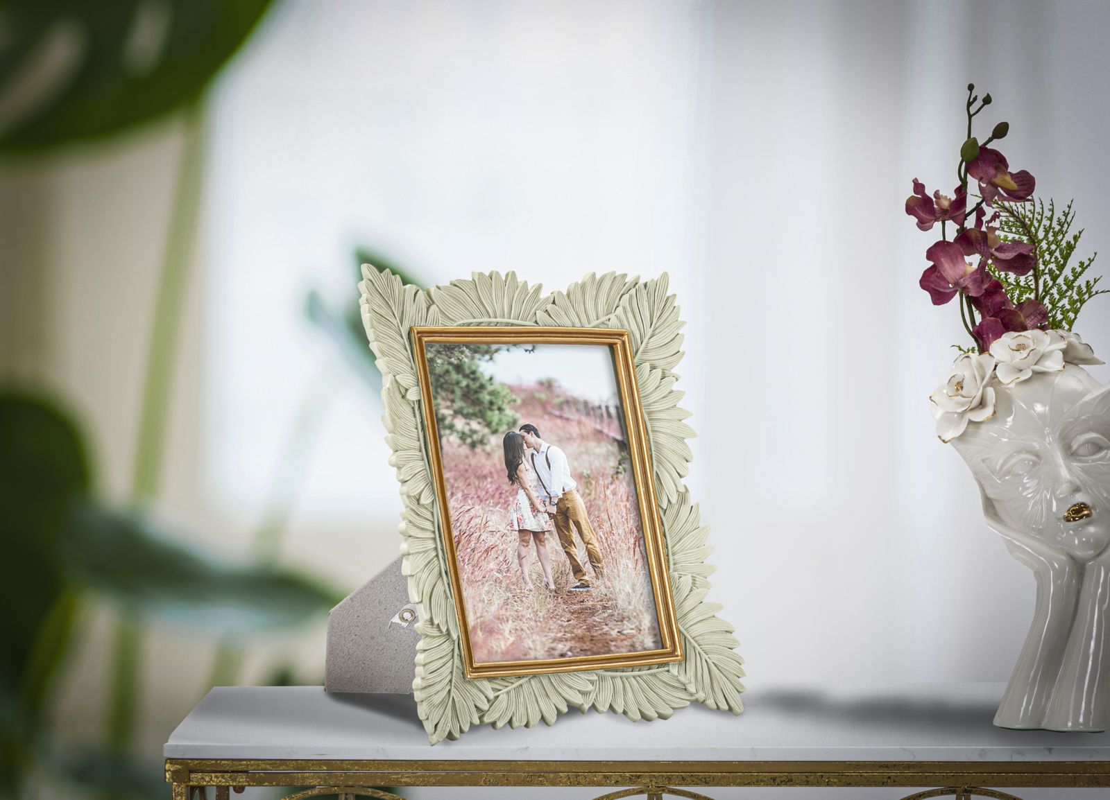 Elegante portafoto con cornice decorata da foglie. Formato foto cm 15x20