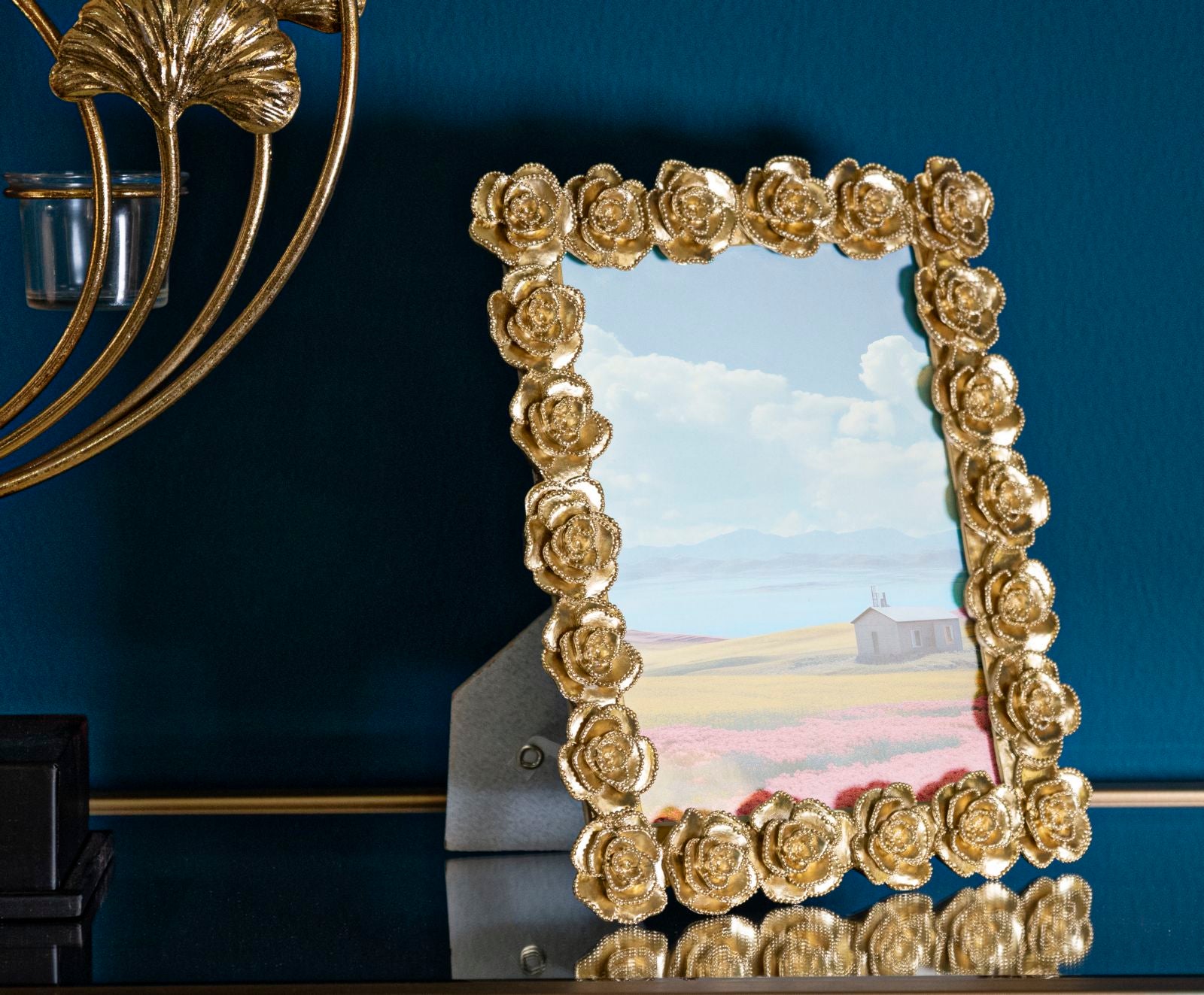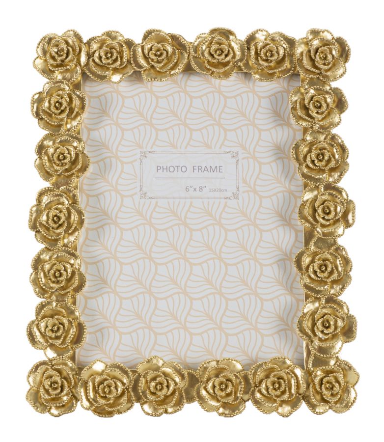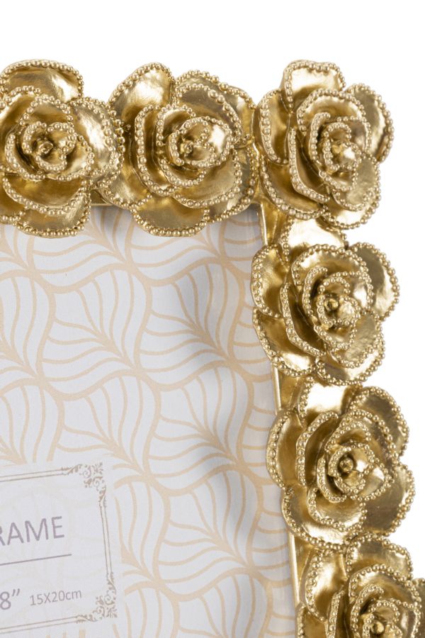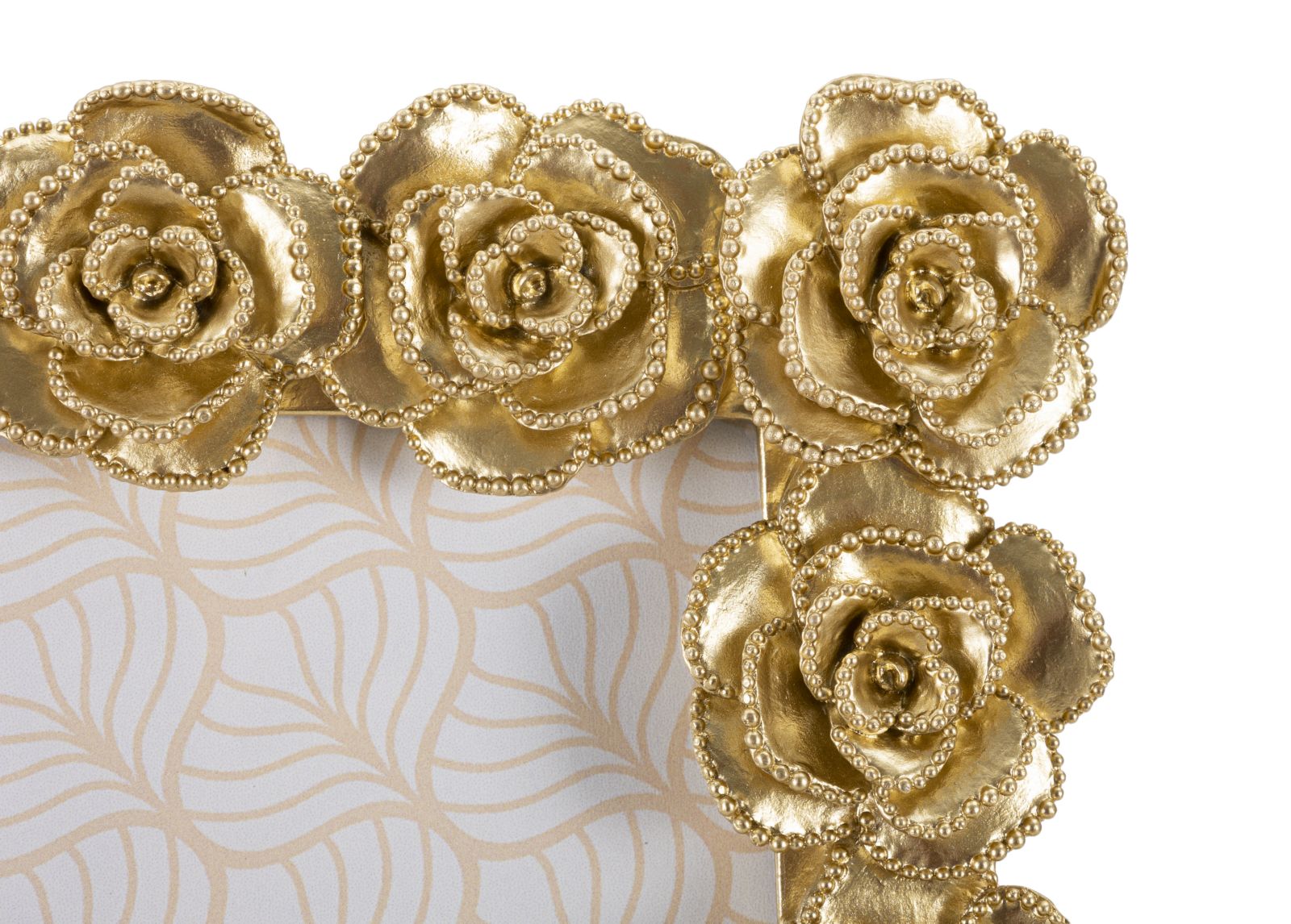 Cornice rettangolare da appoggio in resina dal design composto da un insieme di rose. Pu¨° essere posizionata sia in orizzontale che in verticale. Dimensioni foto cm 15x20.