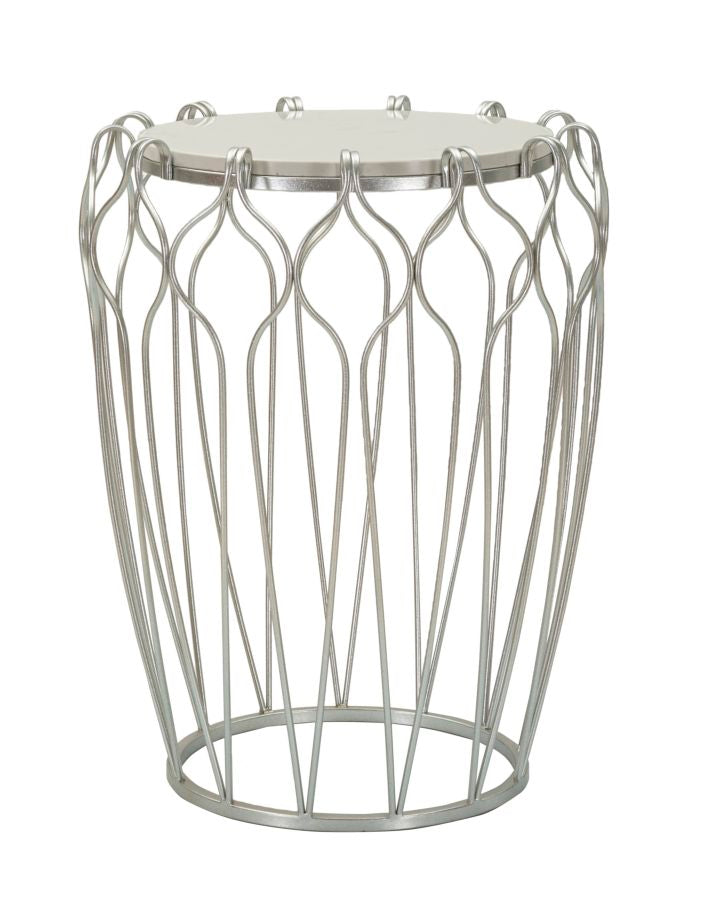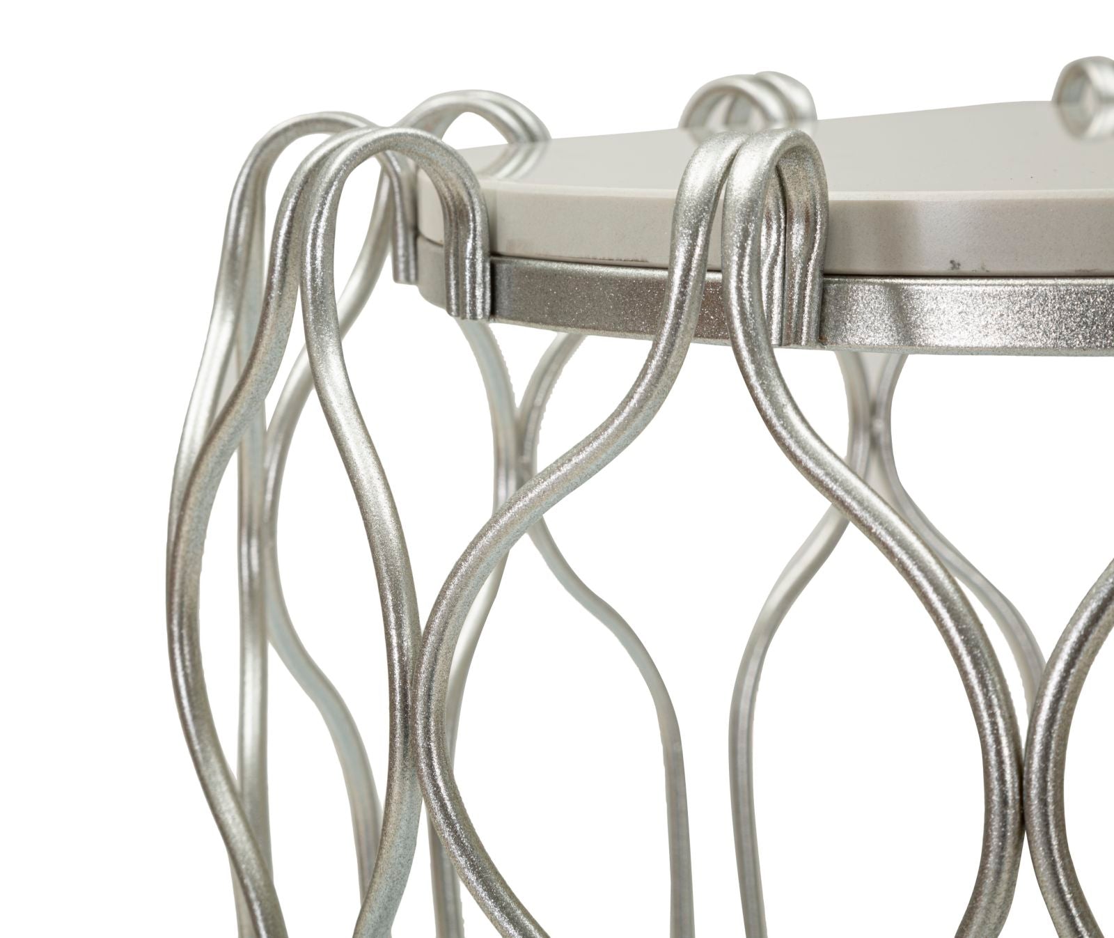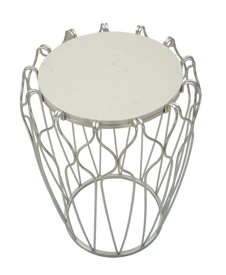 Tavolinetto elegante con base in metallo argentato e top in marmo. La base sinuosa e sembra abbracciare delicatamente il marmo, creando un contrasto raffinato tra la modernit¨¤ del metallo e la nobilt¨¤ del marmo.