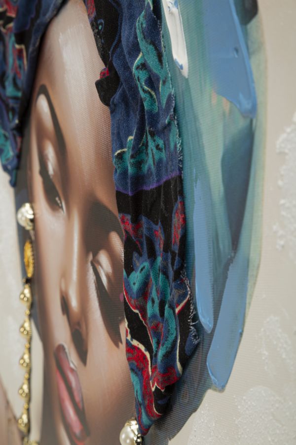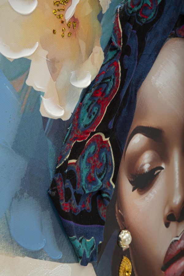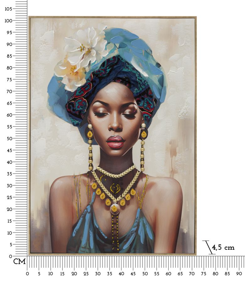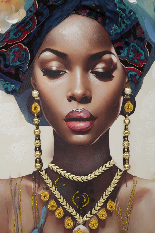 Dipinto su tela con intelaiatura in legno raffigurante una donna in abiti tradizionali e con turbante. Completo di cornice in metallo dorato.
