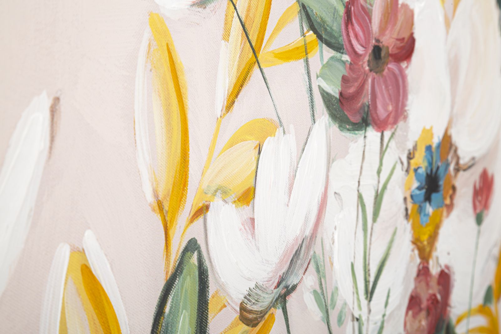 Dipinto su tela completo di telaio in legno raffigurante un insieme di fiori dai colori accesi e sgargianti.