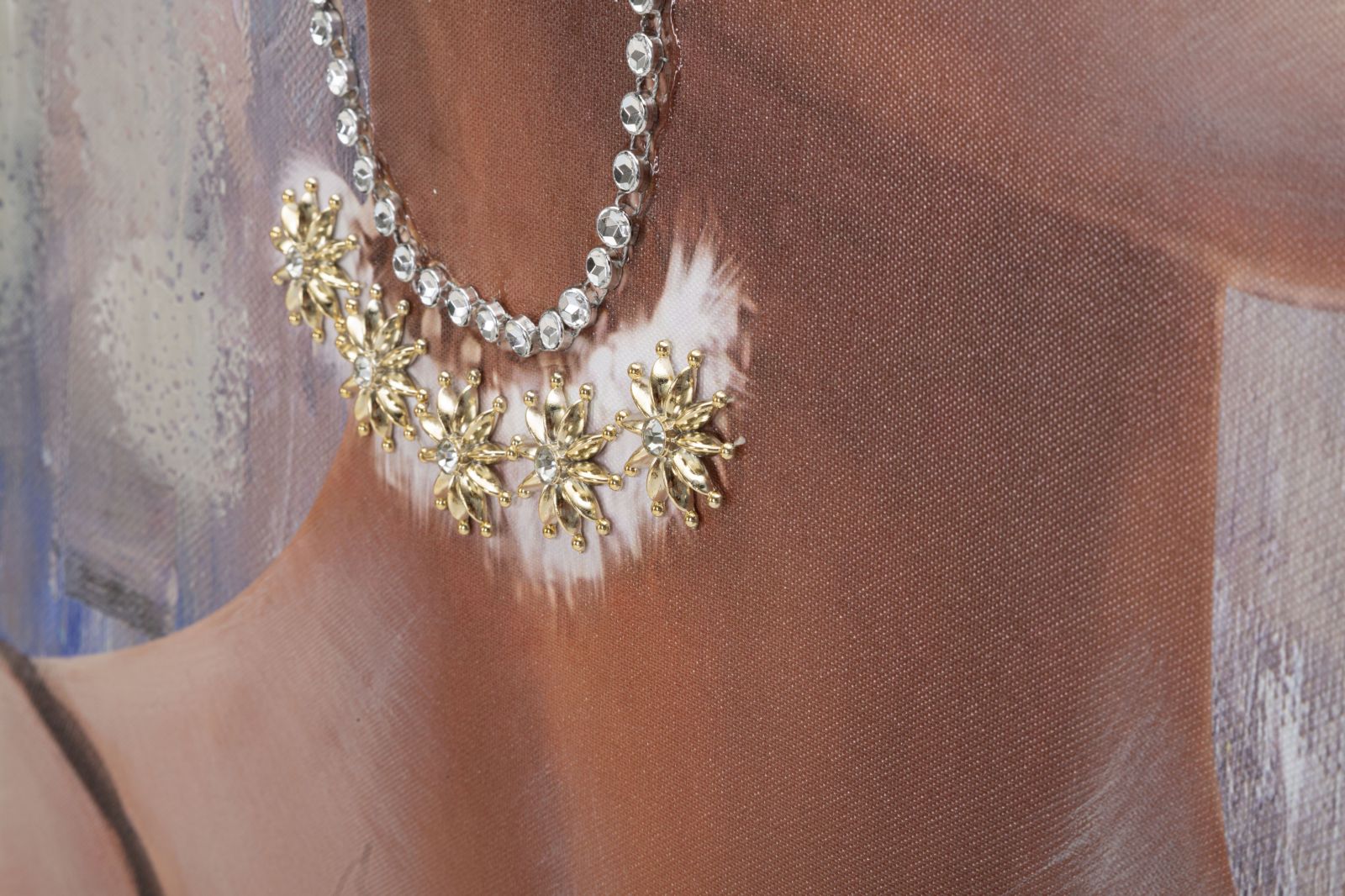 Dipinto su tela completo di telaio in legno raffigurante un volto di donna con copricapo completo di eleganti applicazioni in tessuto.