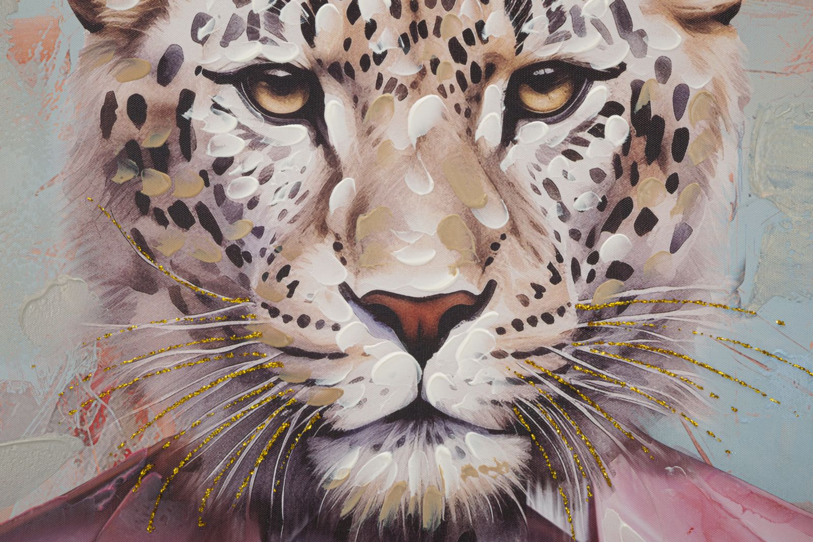 Dipinto su tela dai toni rosa con cornice in metallo dorato e telaio in legno. Leopardo che indossa una corona da re, stile elegante e regale, perfetto per arricchire qualsiasi ambiente con un tocco di maestosit¨¤. Con applicazioni in rilievo.