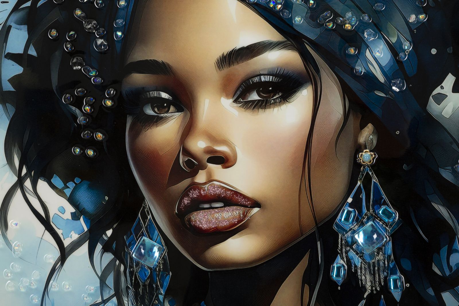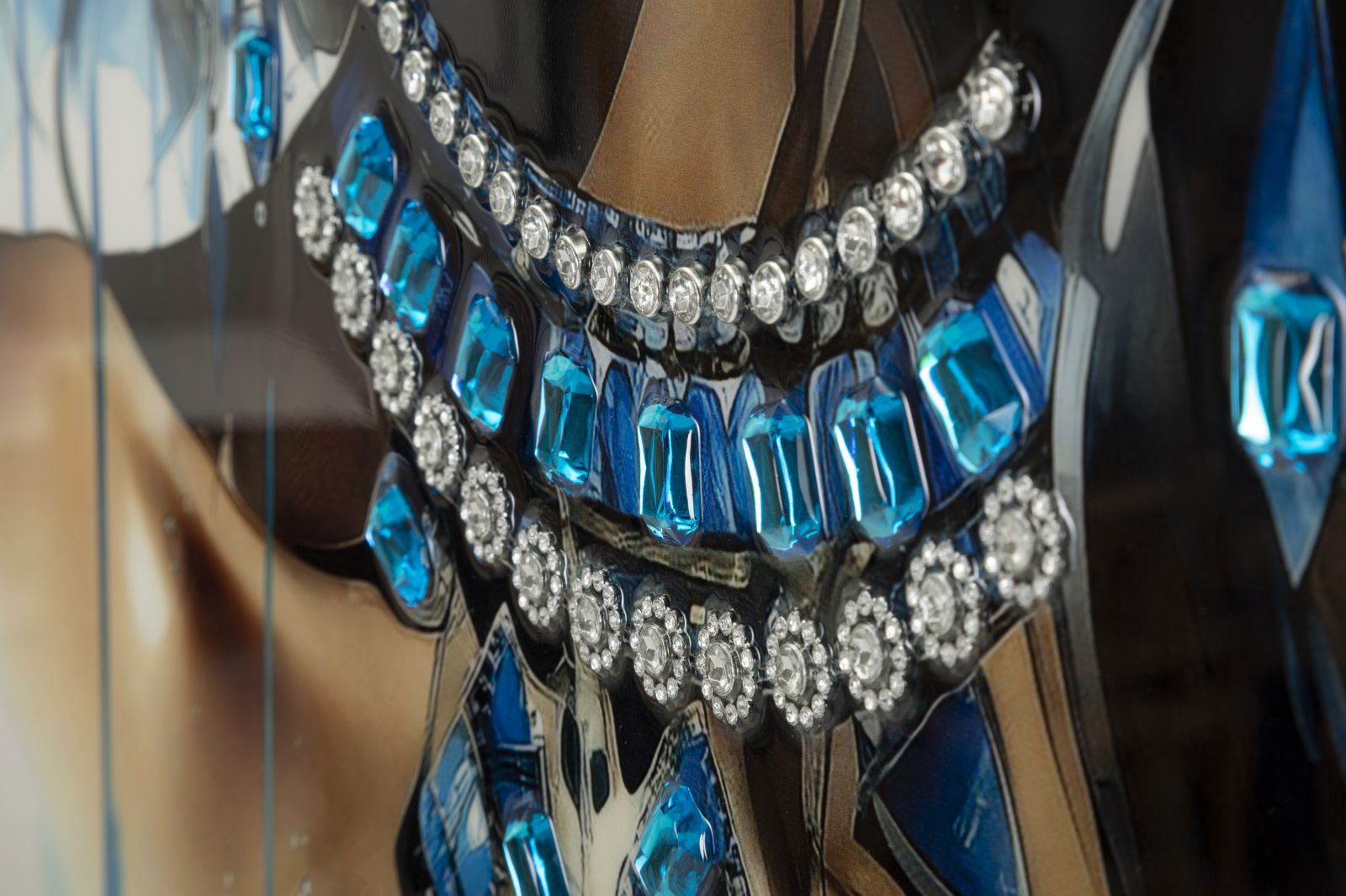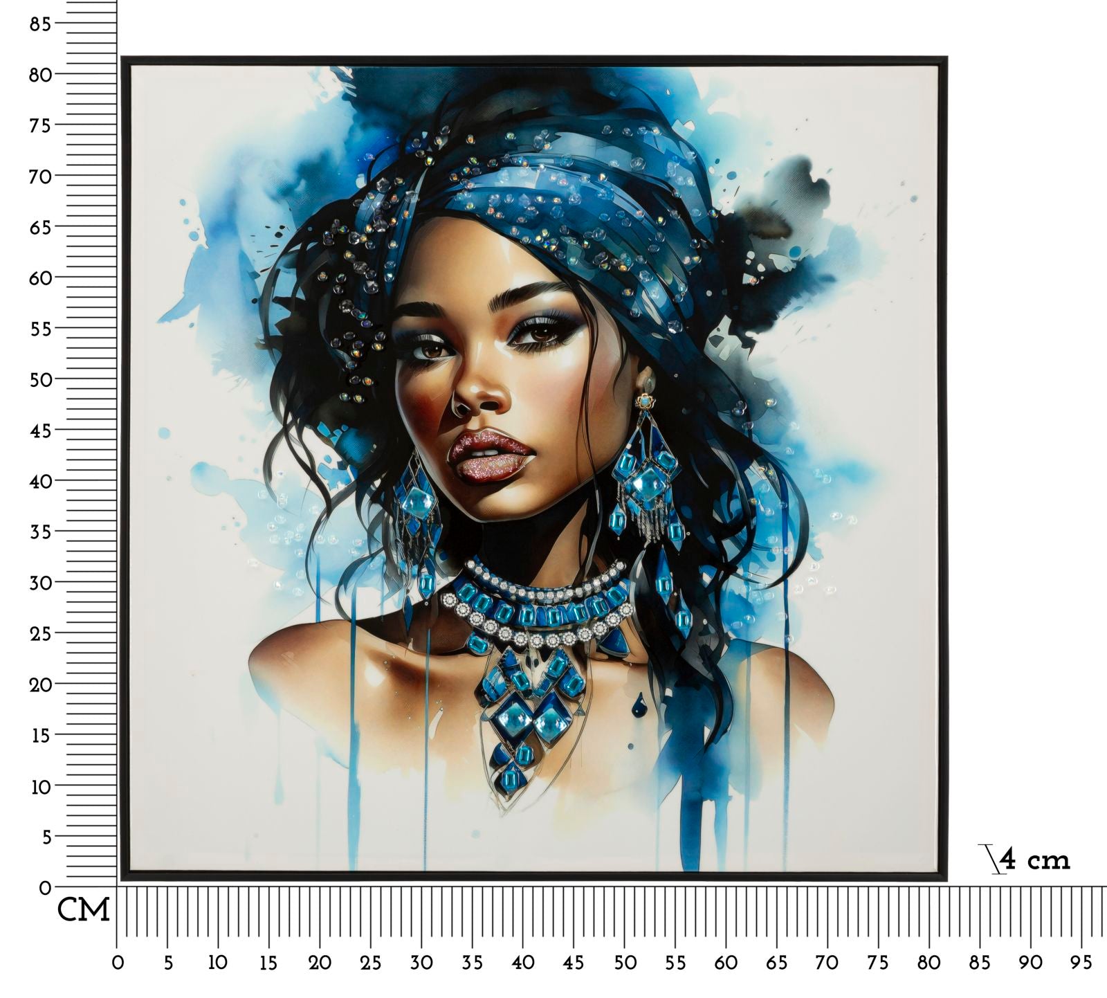 Dipinto su tela completo di telaio in legno e cornice in metallo con donna che indossa un turbante blu e gioielli sfavillanti, un'espressione di regalit¨¤ e cultura vibrante. Con applicazioni in rilievo.