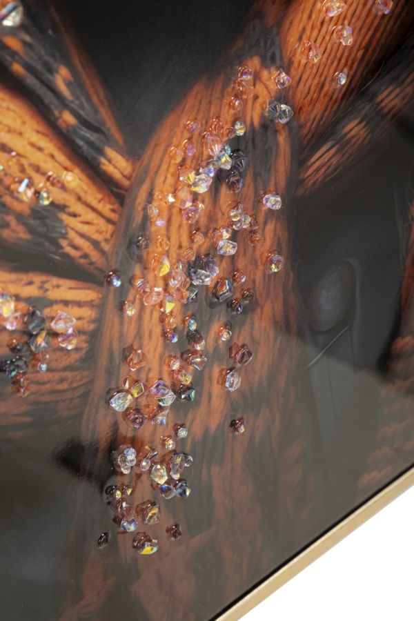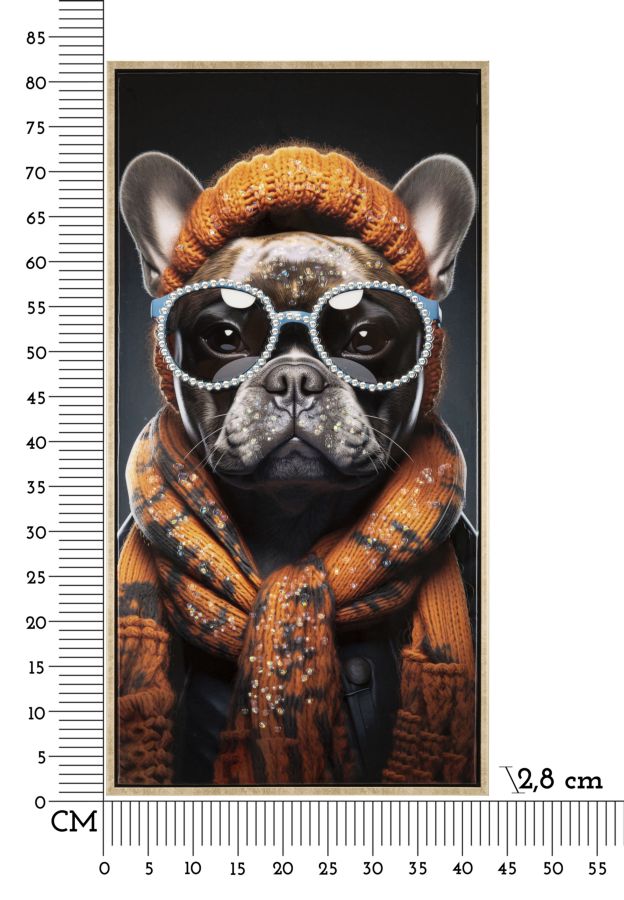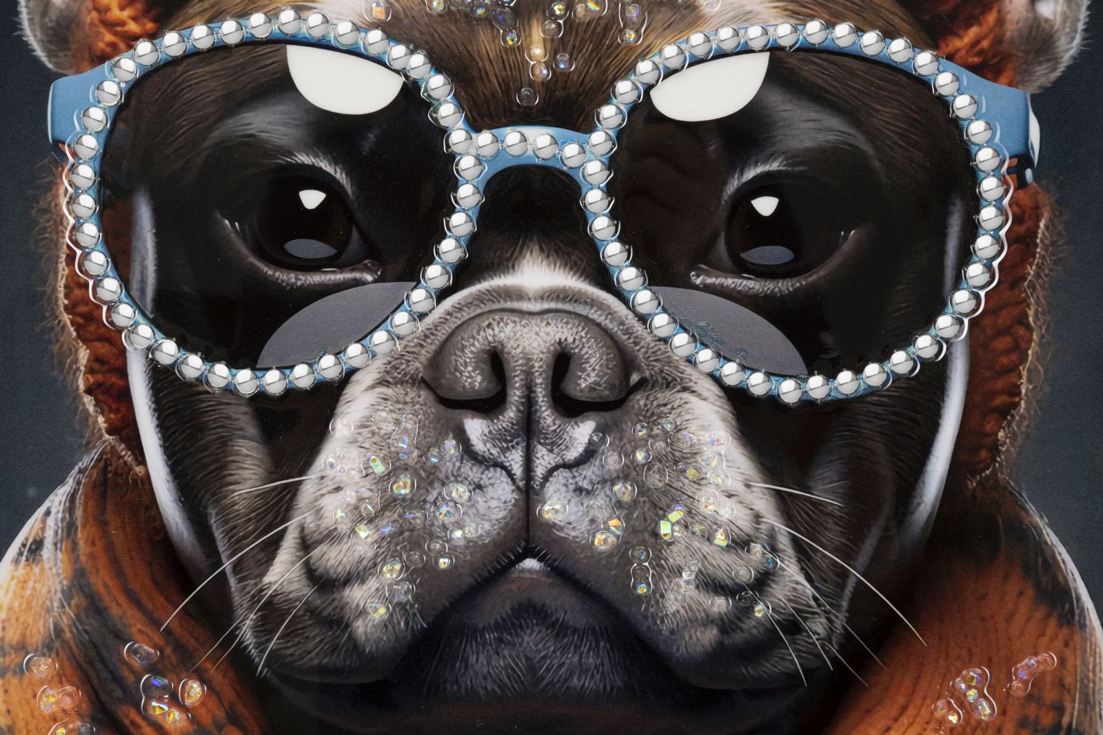 Dipinto su tela completo di telaio in legno e cornice dorata in metallo, raffigurante un bulldog con occhiali da sole e un'espressione simpatica, ideale per aggiungere stile e personalit¨¤ a qualsiasi ambiente. Con applicazioni in rilievo.