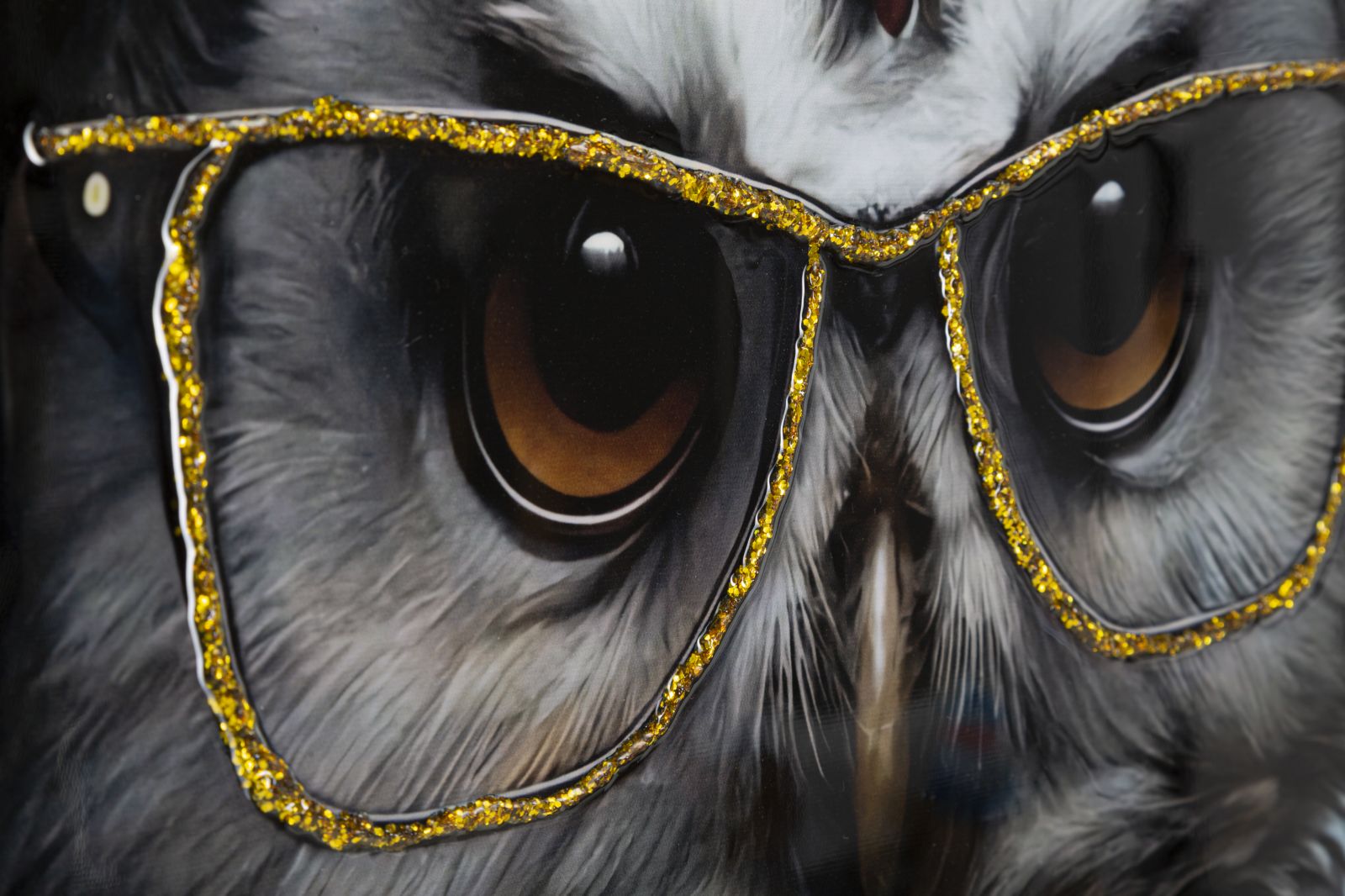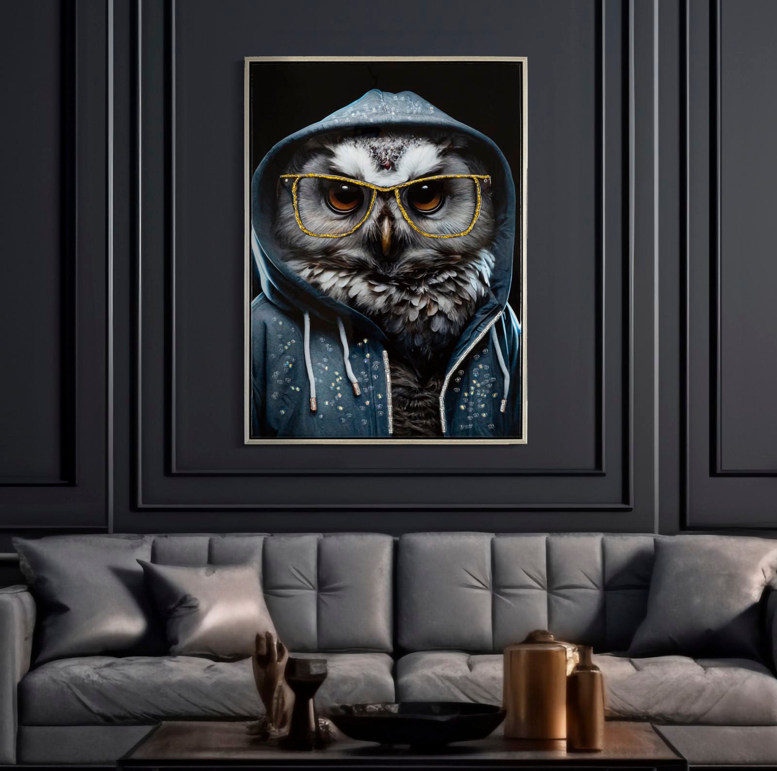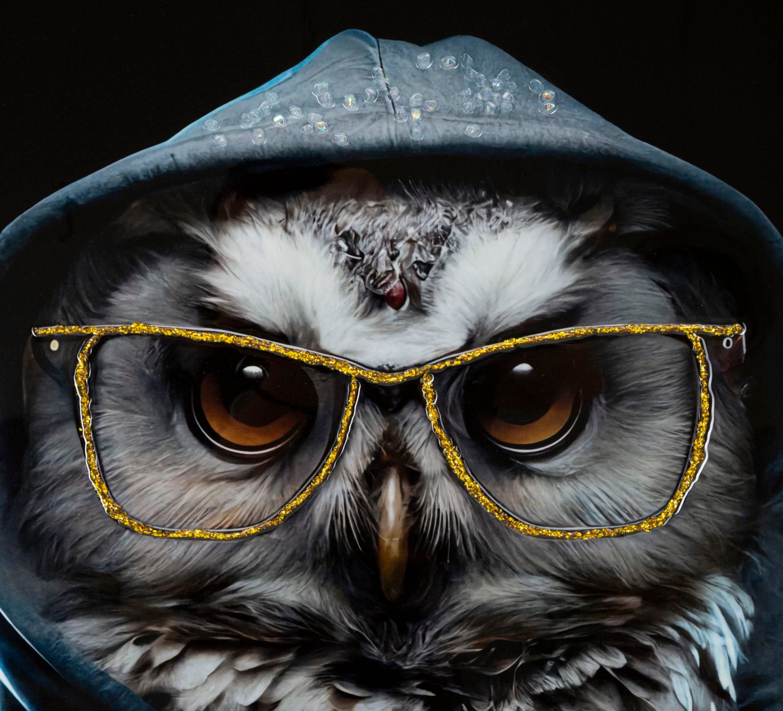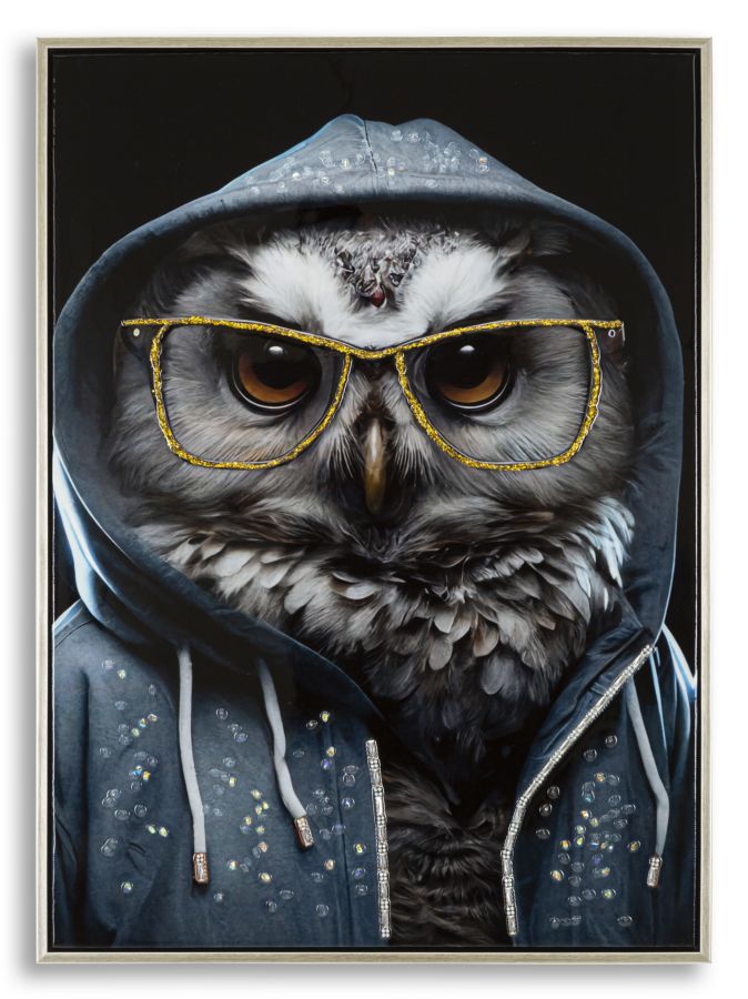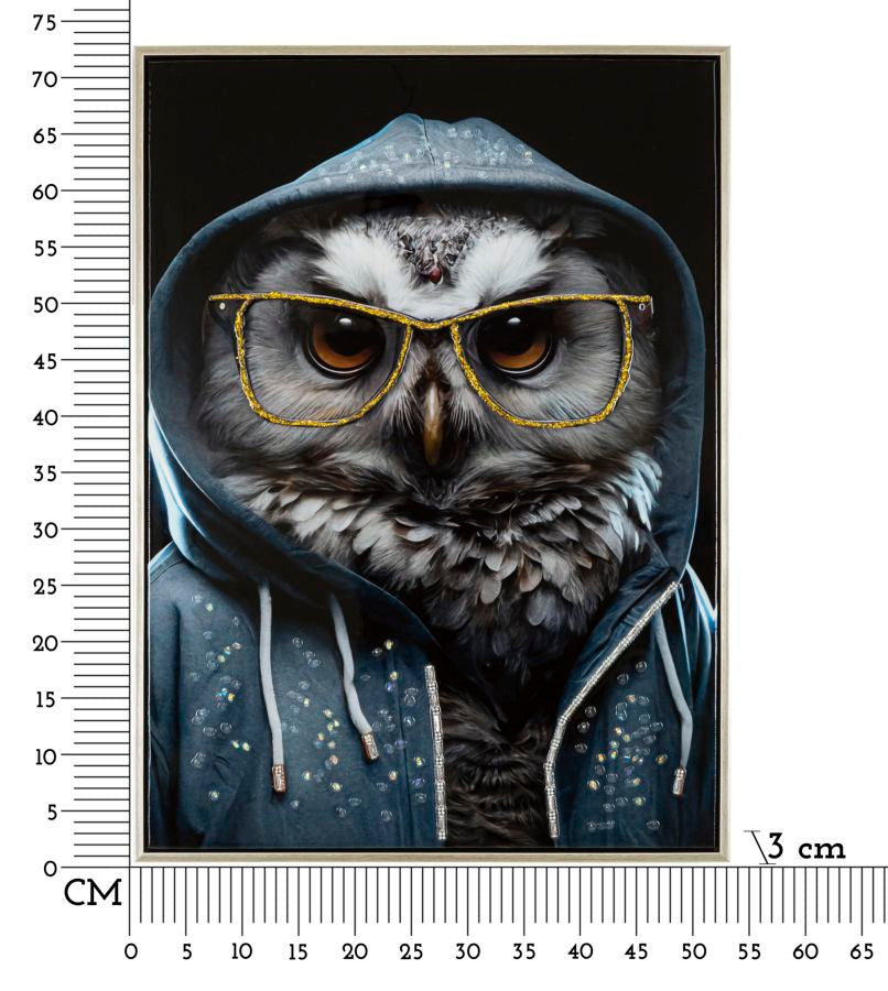Dipinto su tela completo di telaio in legno e cornice in metallo argento con gufo che indossa occhiali dorati mentre posa con atteggiamento sicuro e cool. Con applicazioni in rilievo.