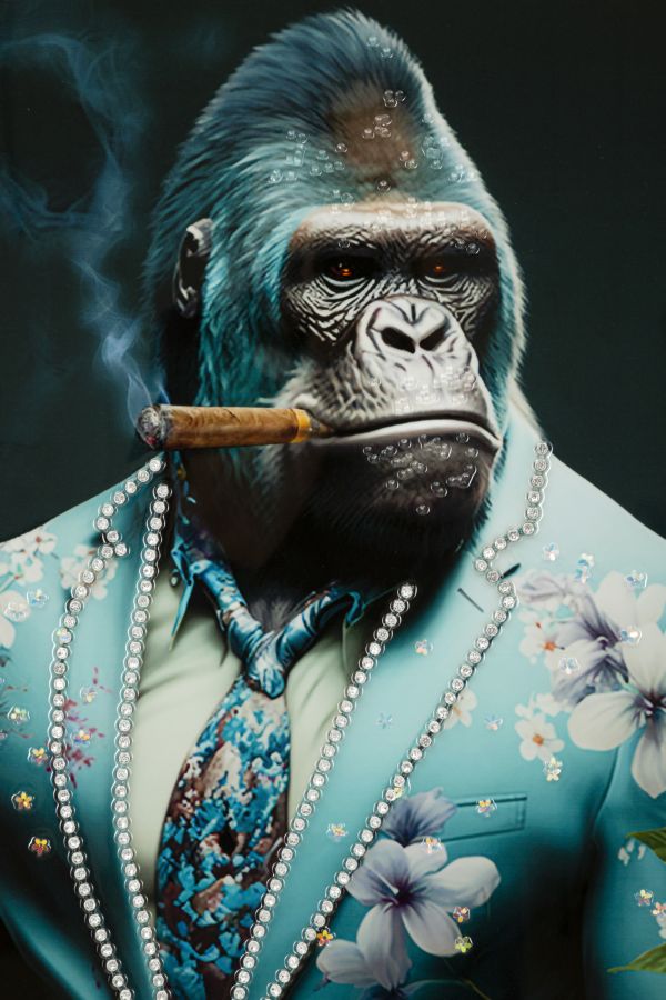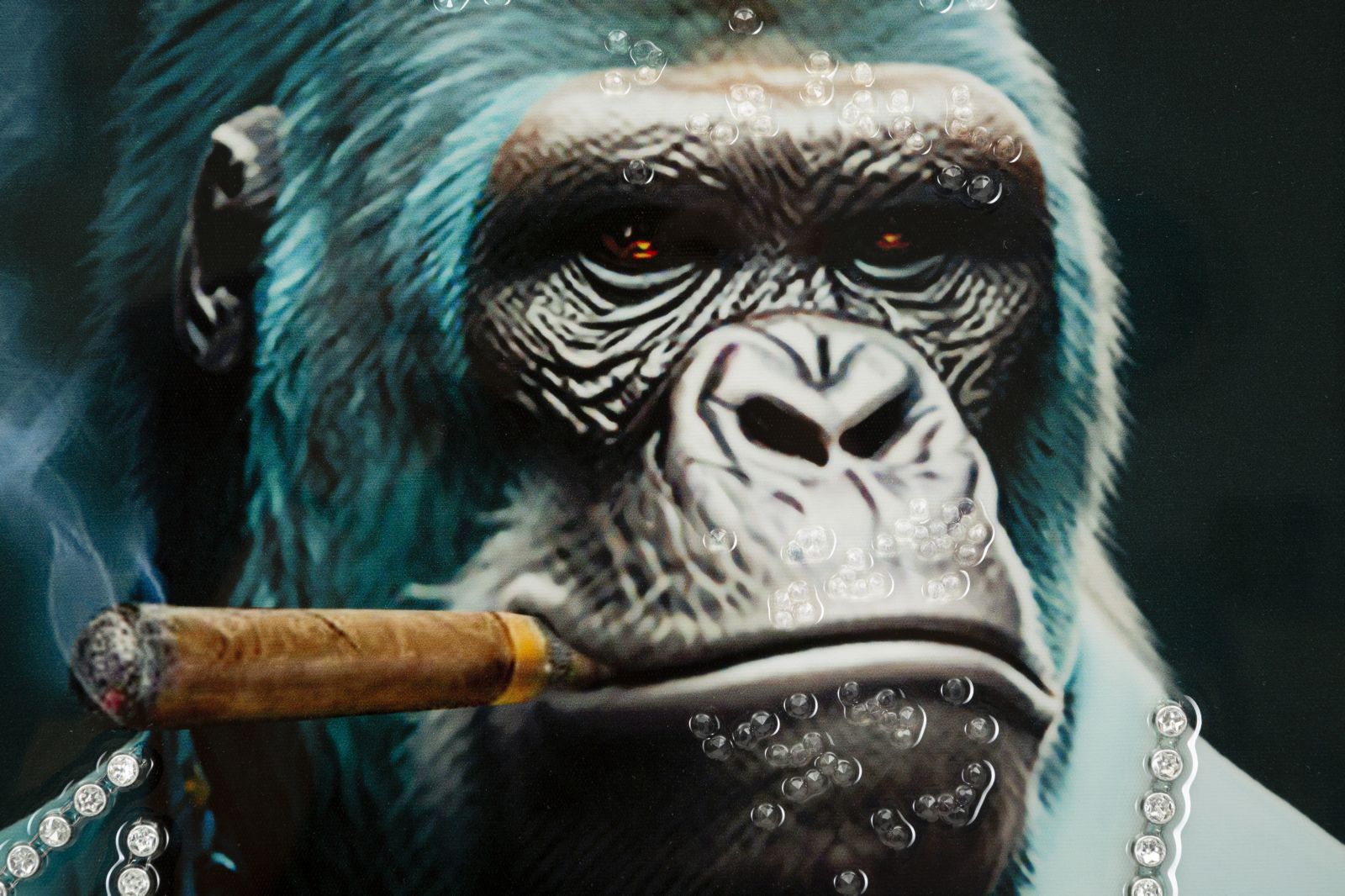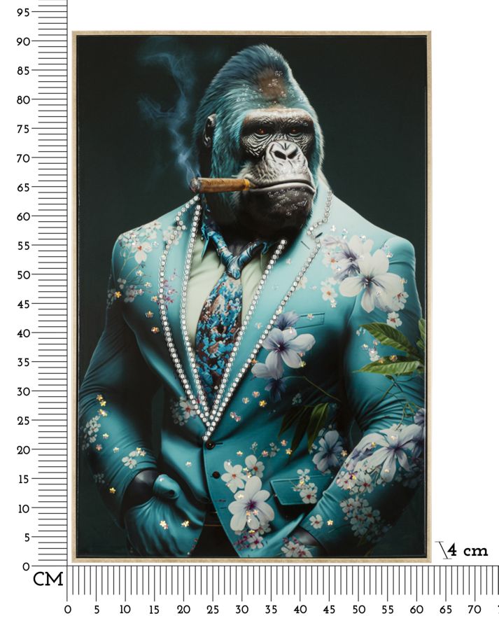 Dipinto su tela con telaio in legno e cornice dorata. gorilla che fuma un sigaro, vestito in completo elegante con dettagli in rilievo. Perfetto per dare un tocco unico a qualsiasi ambiente.