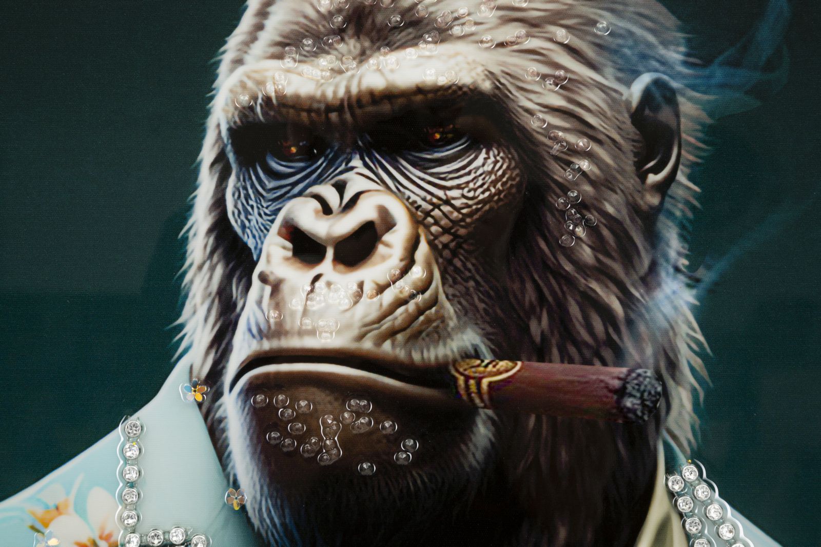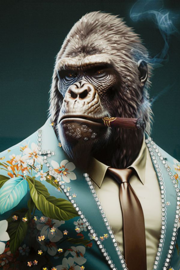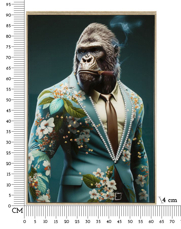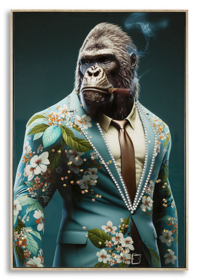 Dipinto su tela con telaio in legno e cornice dorata. gorilla che fuma un sigaro, vestito in completo elegante con dettagli in rilievo. Perfetto per dare un tocco unico a qualsiasi ambiente.