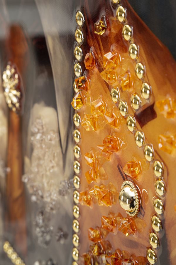 Dipinto su tela completo di telaio in legno e cornice in metallo oro, scimmia che indossa un completo arancione e occhiali da sole straordinari. Con applicazioni in rilievo.