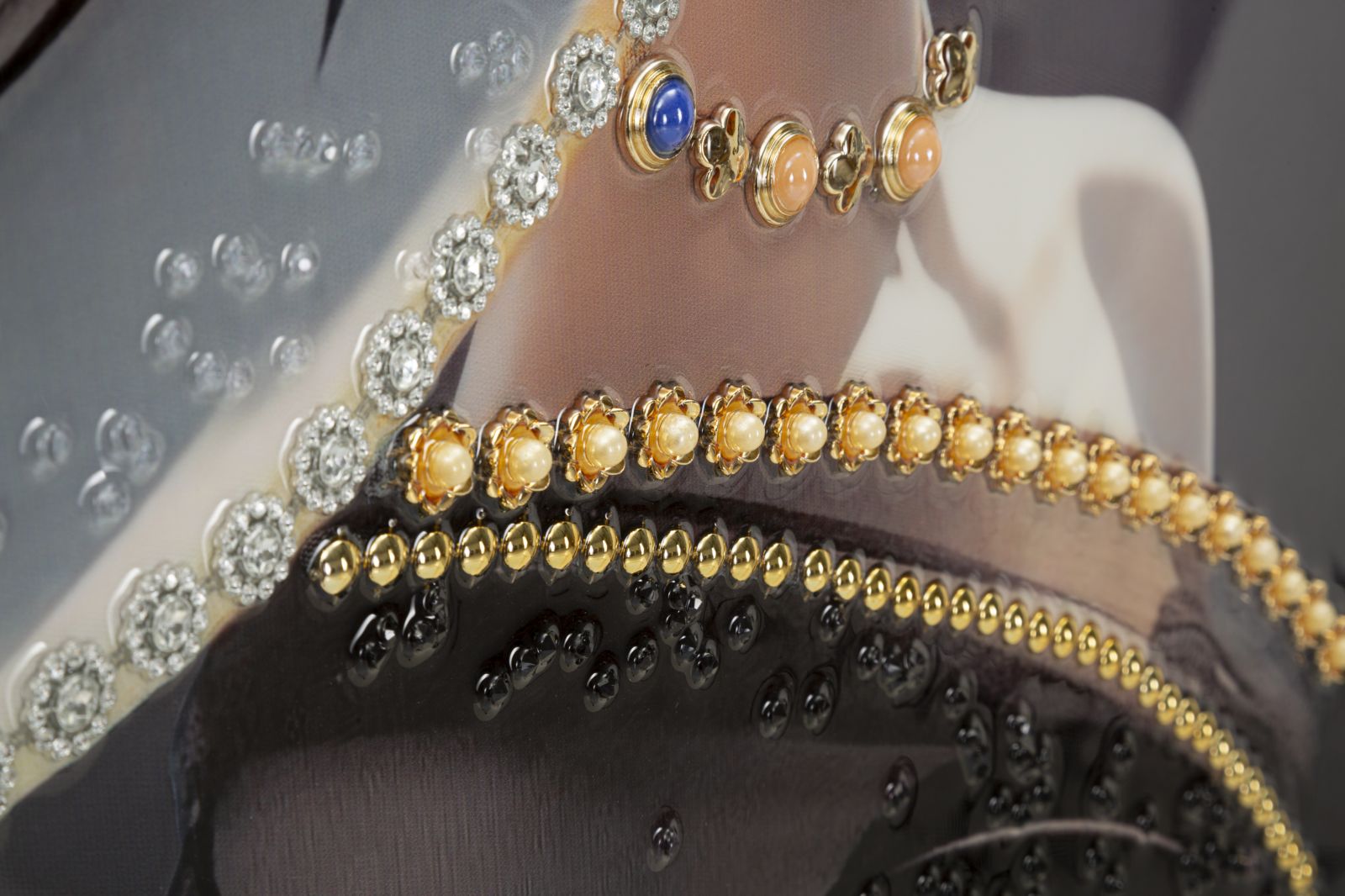 Dipinto su tela completo di telaio in legno e cornice in metallo oro con una donna che indossa un grande cappello con fiore, espressione di eleganza e raffinatezza senza tempo.