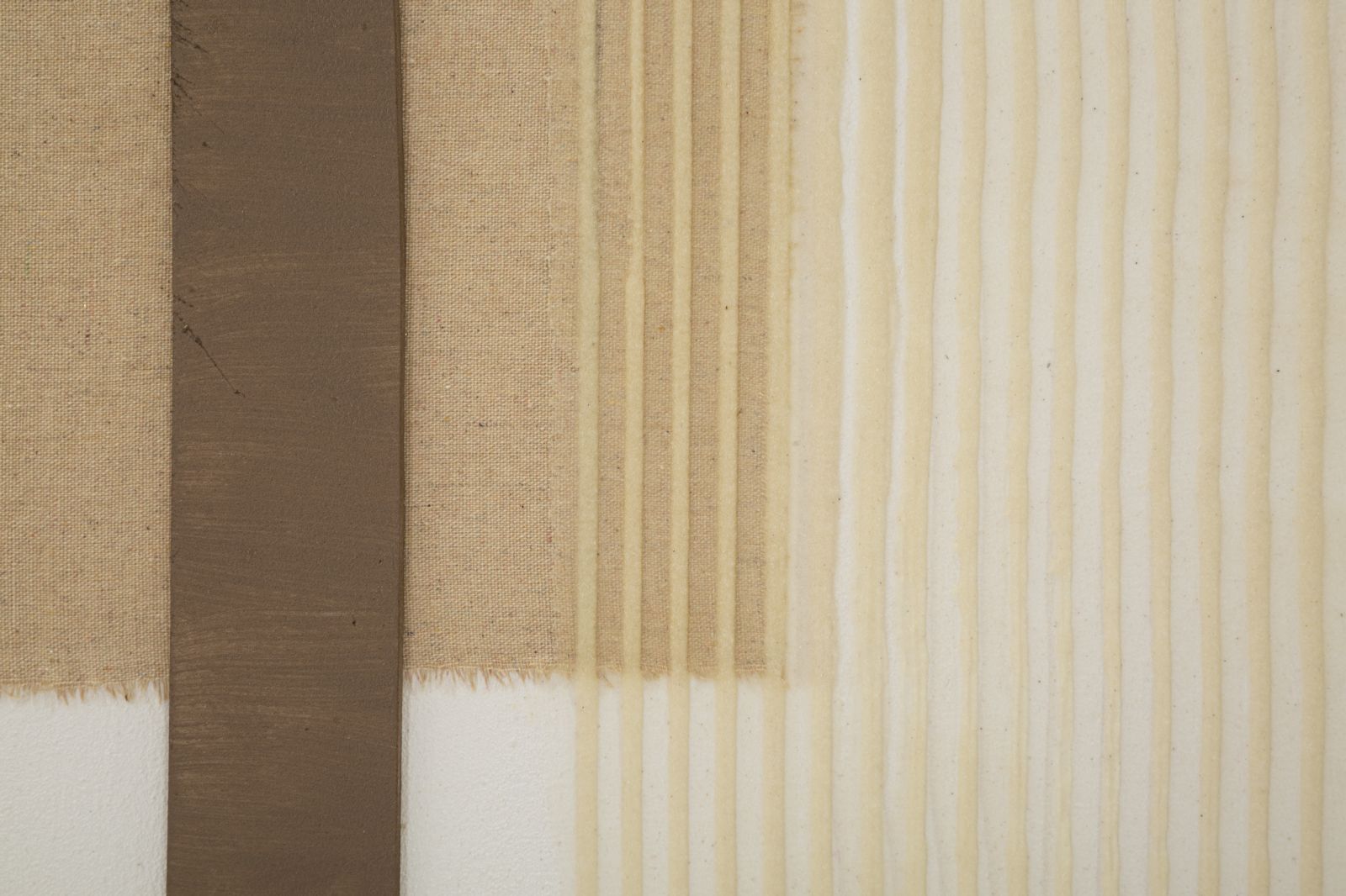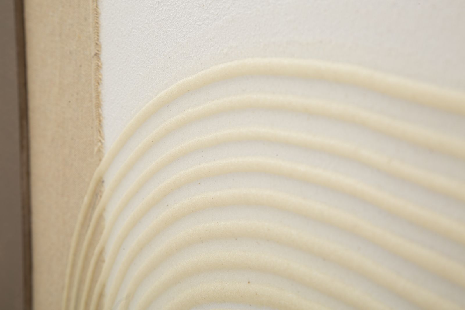 Dipinto su tela completo di telaio in legno dal design astratto con applicazioni.