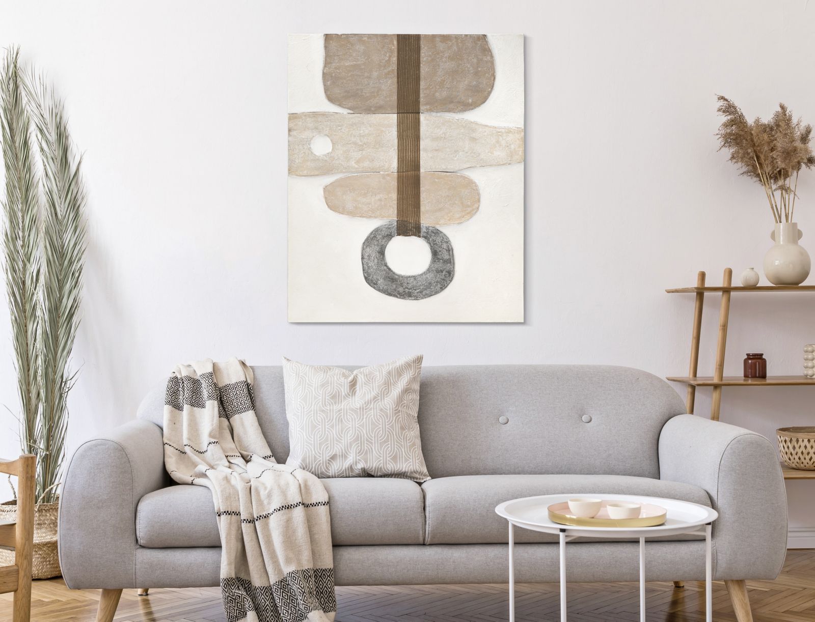 Dipinto su tela completo di telaio in legno dal design astratto con applicazioni.