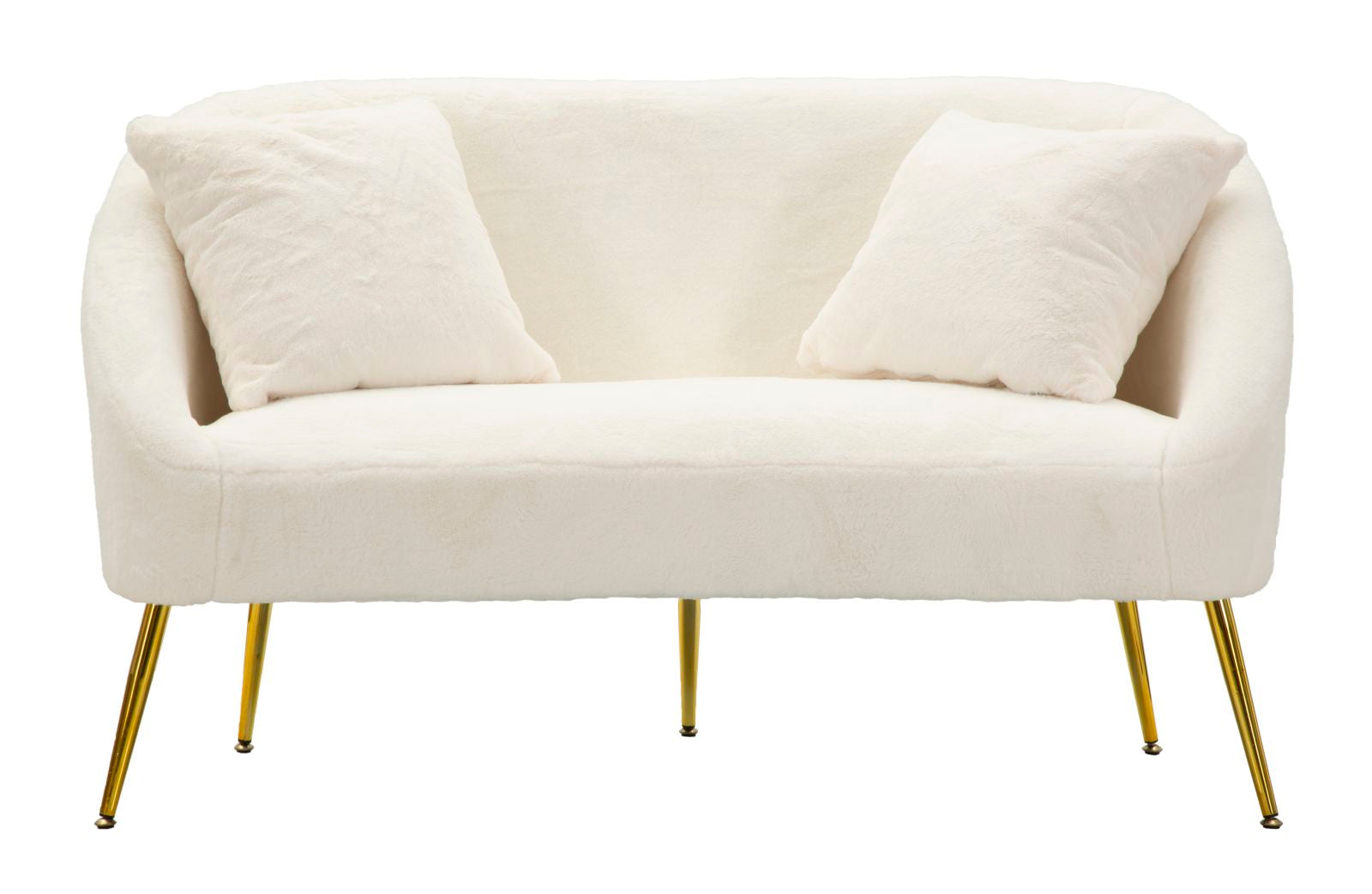 Divano due posti bianco con gambe dorate da assemblare, rivestito in morbida pelliccia sintetica. Ideale per ambienti moderni e raffinati, aggiunge un tocco di lusso e comfort.