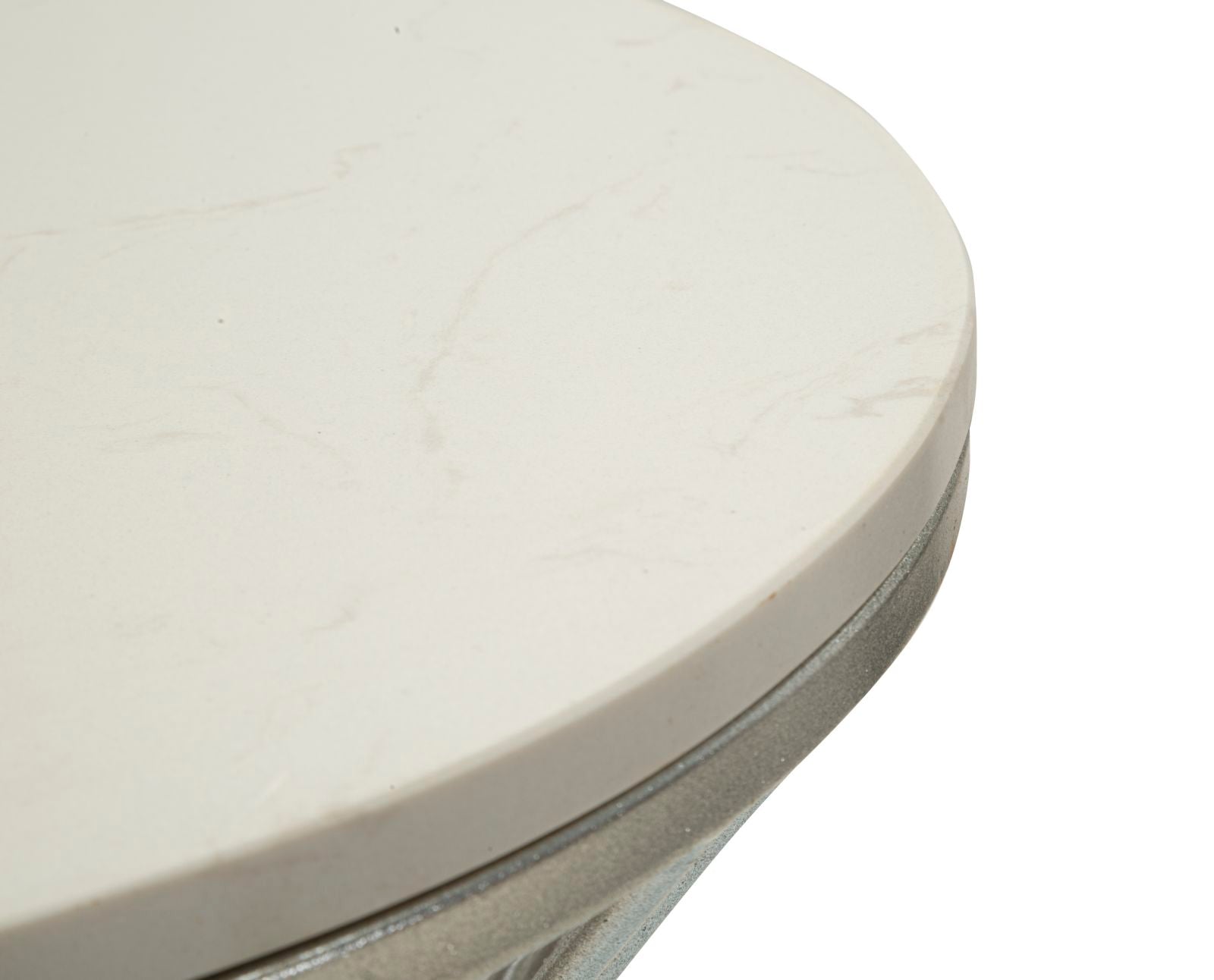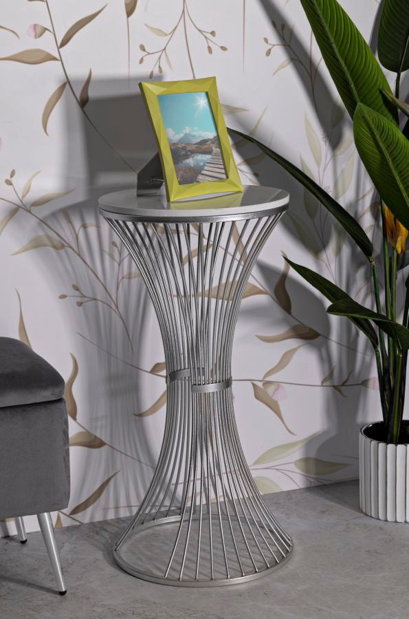 Tavolinetto in metallo argentato con base a linee intrecciate, che si uniscono con eleganza. Il top in marmo, con le sue venature naturali, aggiunge un tocco di raffinatezza.