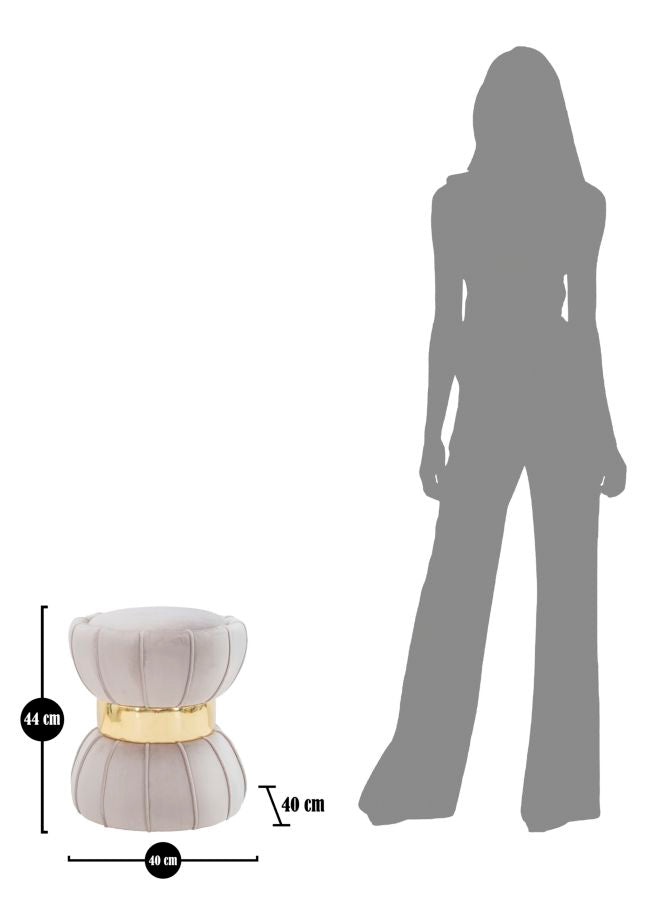 Sgabello rotondo imbottito in velluto sintetico con un elegante fascia deccorativa dorata centrale. La forma ricorda una clessidra.