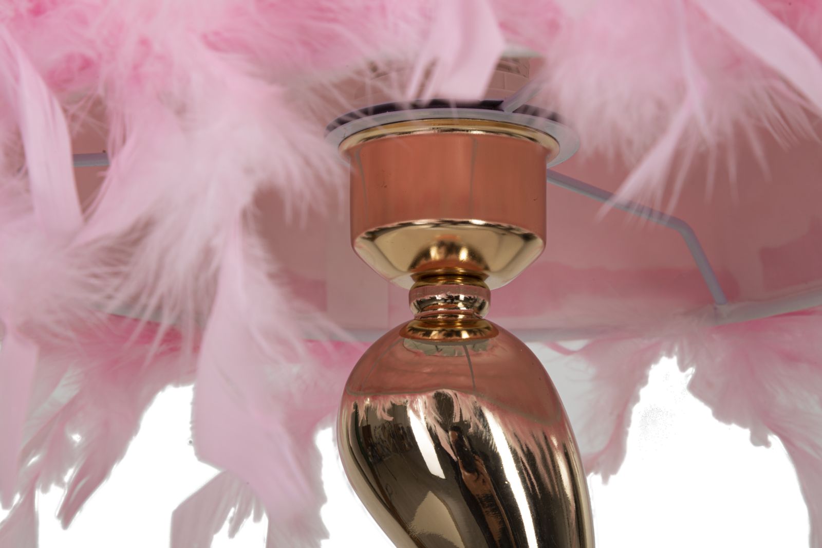 Lampada da tavolo in metallo dorato dal design design morbido e sinuoso, completo di paralume con eleganti piume sintetiche.