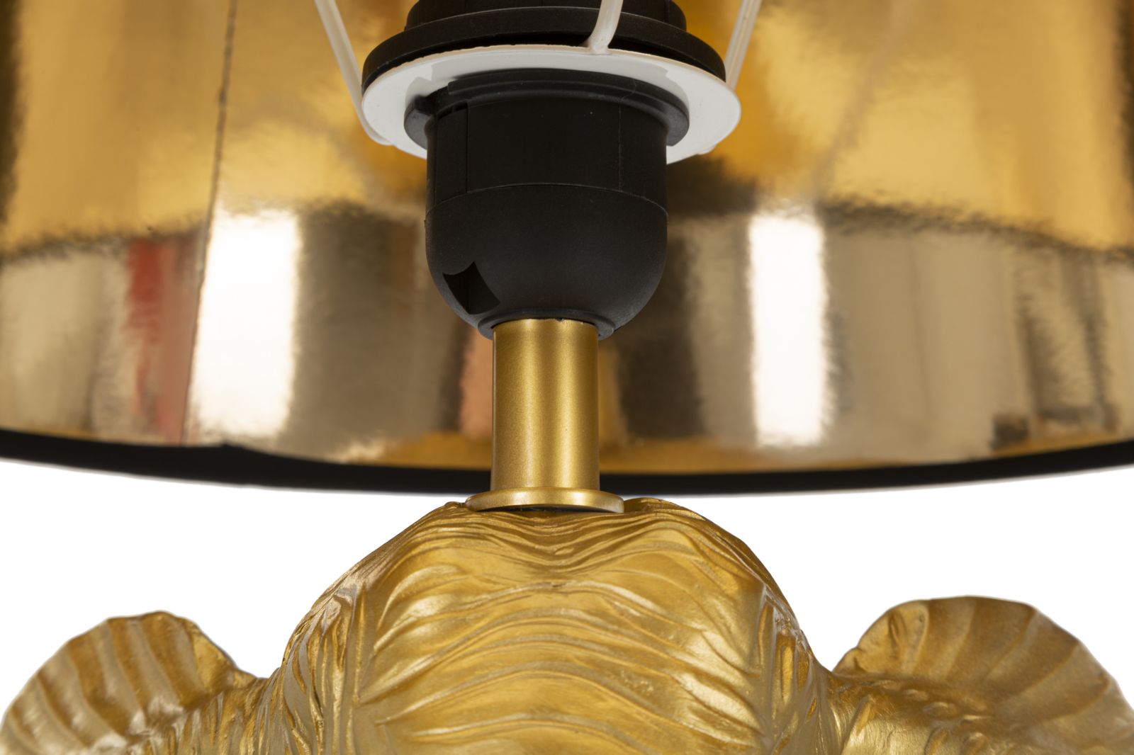 Lampada da tavolo in metallo nero con testa di elefante dorato decorativo con parlume in tessuto nero.