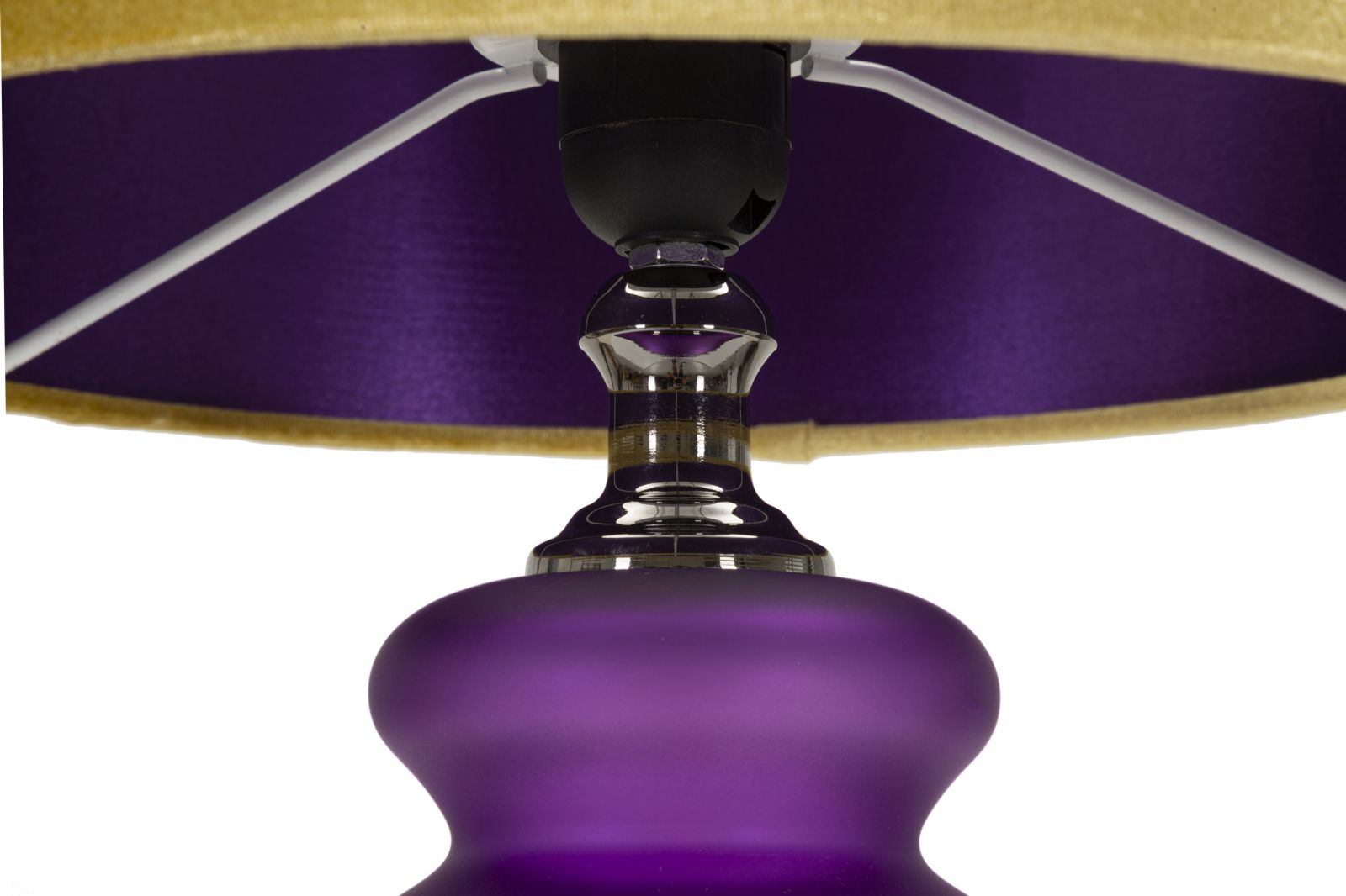 Lampada affascinante con base in vetro viola e paralume in velluto dorato: l'eleganza si fonde con il mistero in un gioco di luci e ombre suggestivo e caldo.