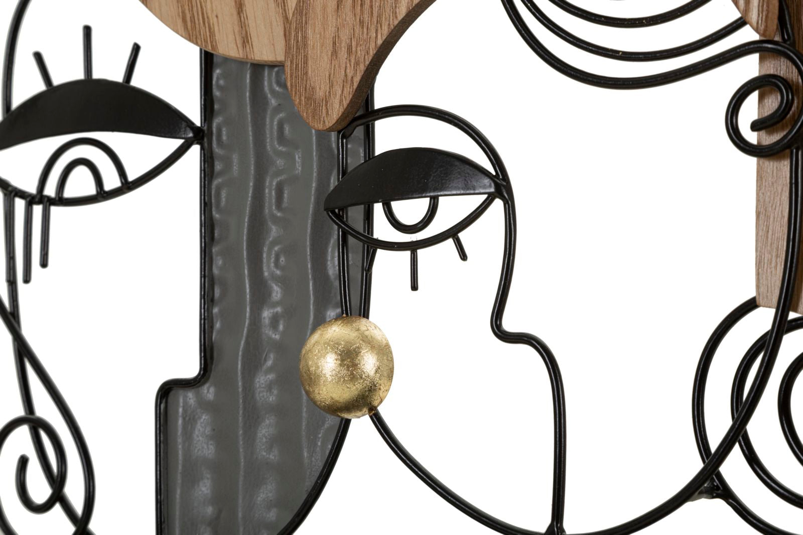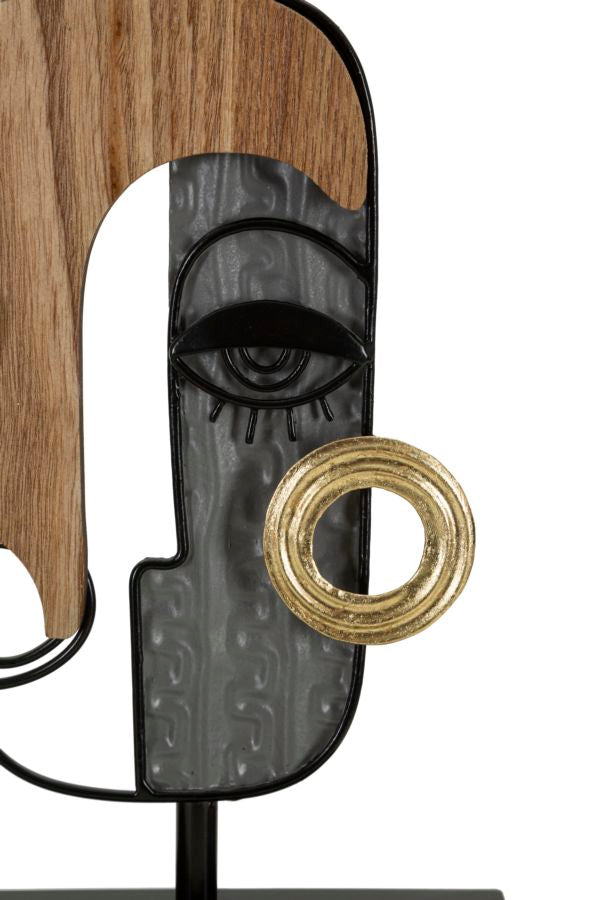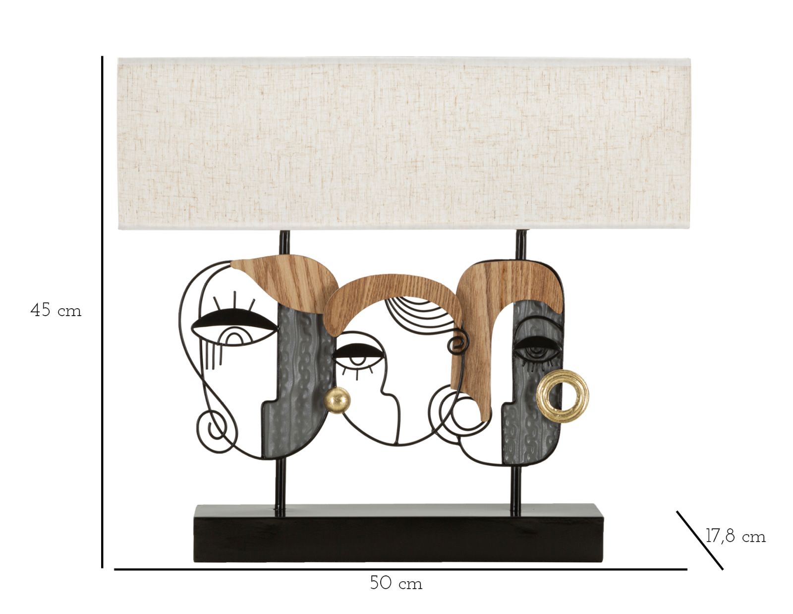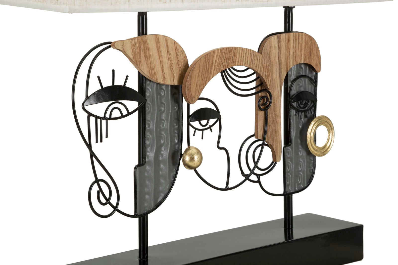 Lampada da tavolo con 2 punti luce in metallo e legno impreziosita da volti che richiamano l'arte cubista. Completa di paralume in tessuto bianco.