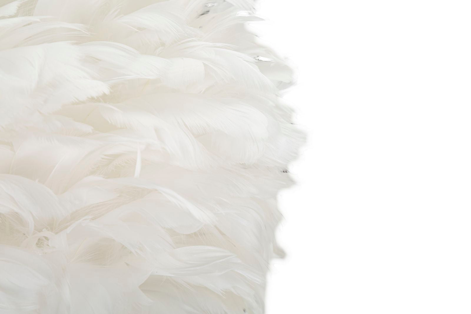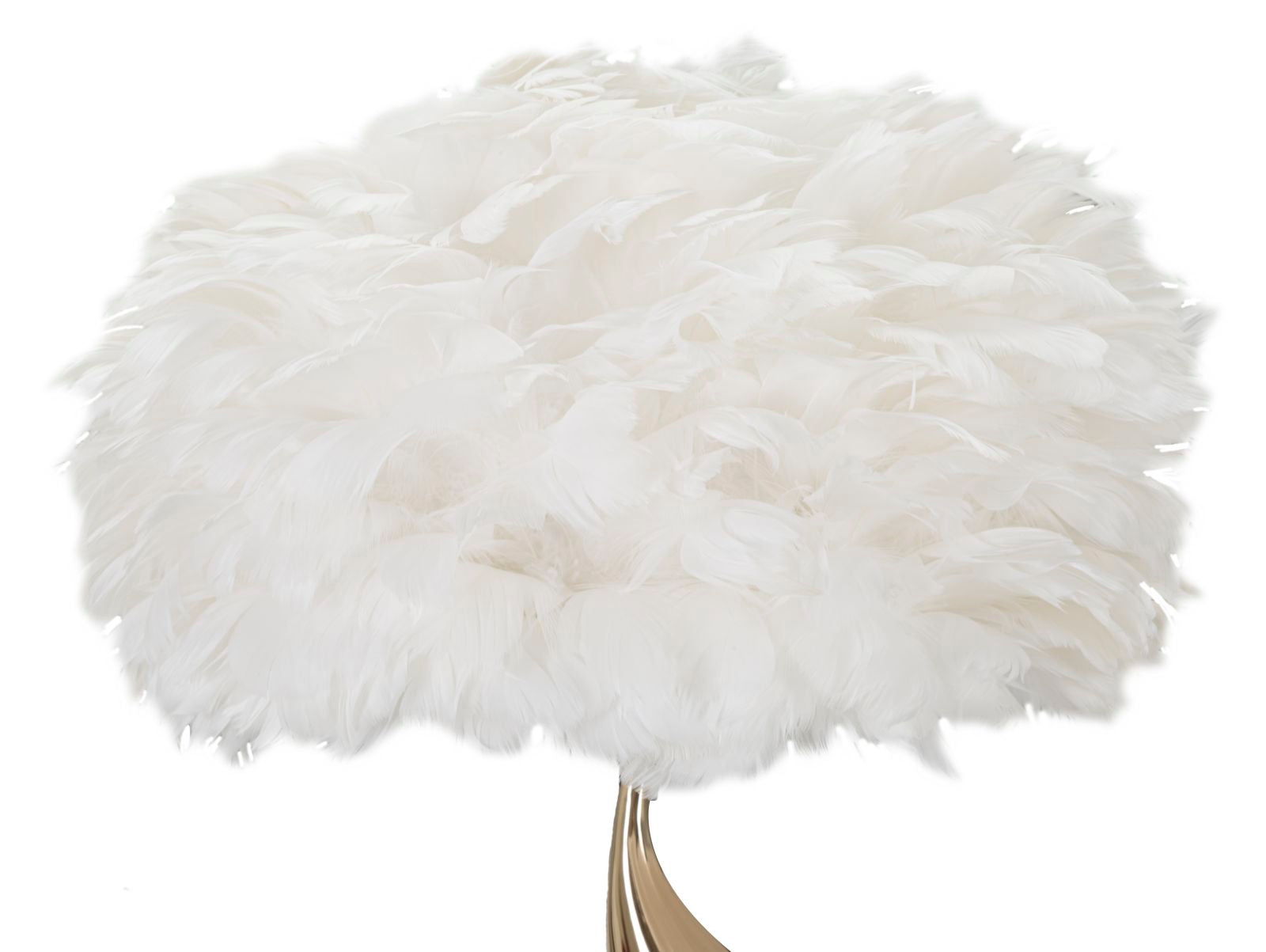 Lampada da tavolo in metallo dorato con elegante decorazione morbida e sinuosa completa di paralume composto da piume.