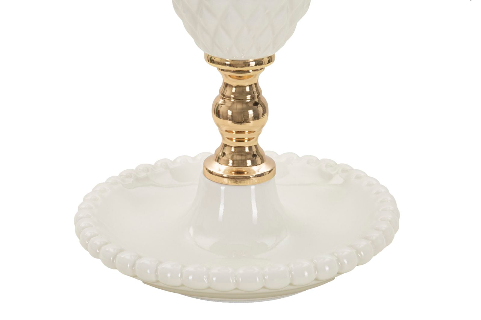 Lampada in ceramica bianca con rifiniture dorate dal design semplice ed elegante. Completa di paralume in tessuto bianco.