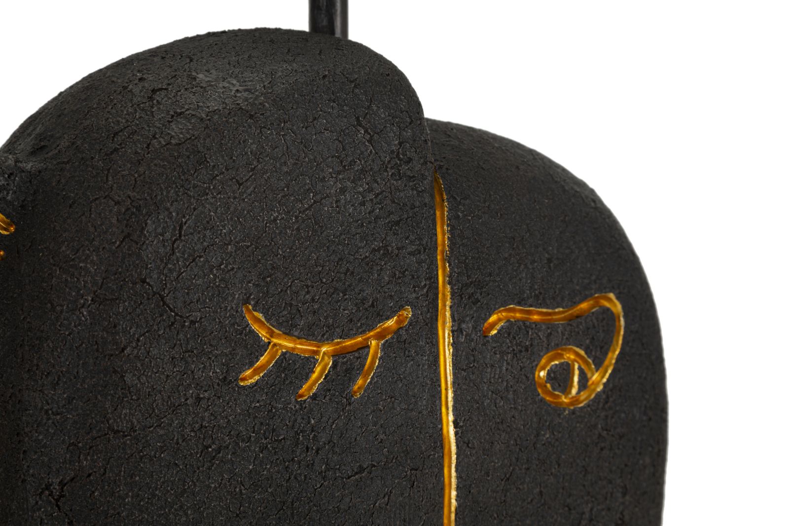 Lampada da tavolo in resina dalla forma ispirata ad un volto tribale impreziosita da tratti dorati. Completa di paralume in tessuto grigio.