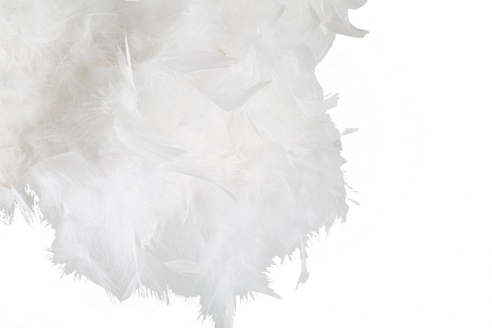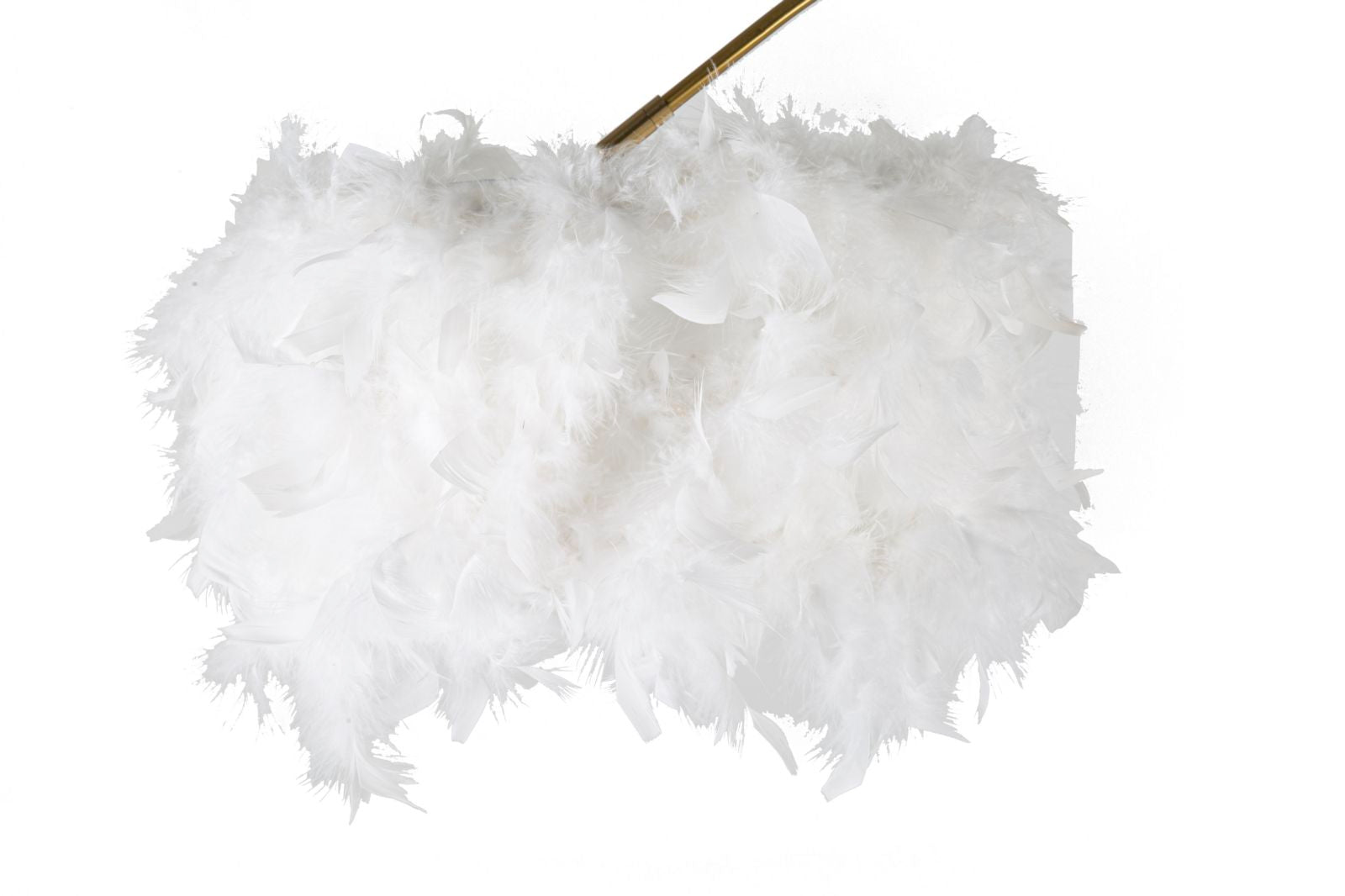 Piantana in metallo nero dal design arcuato e lineare completa di elegante paralume composto da piume sintetiche.