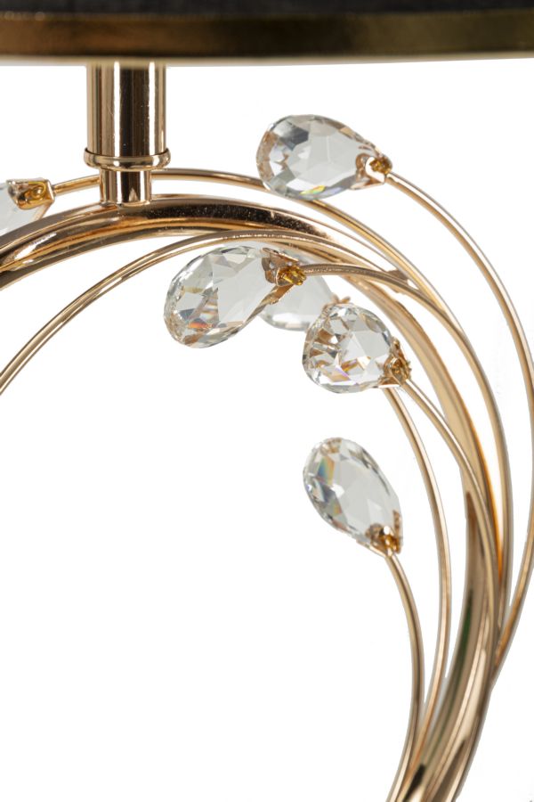 Piantana in metallo dorato con decorazione geometrica con eleganti applicazioni che ricordano dei fiori. Completa di paralume in tessuto nero con finiture dorate.