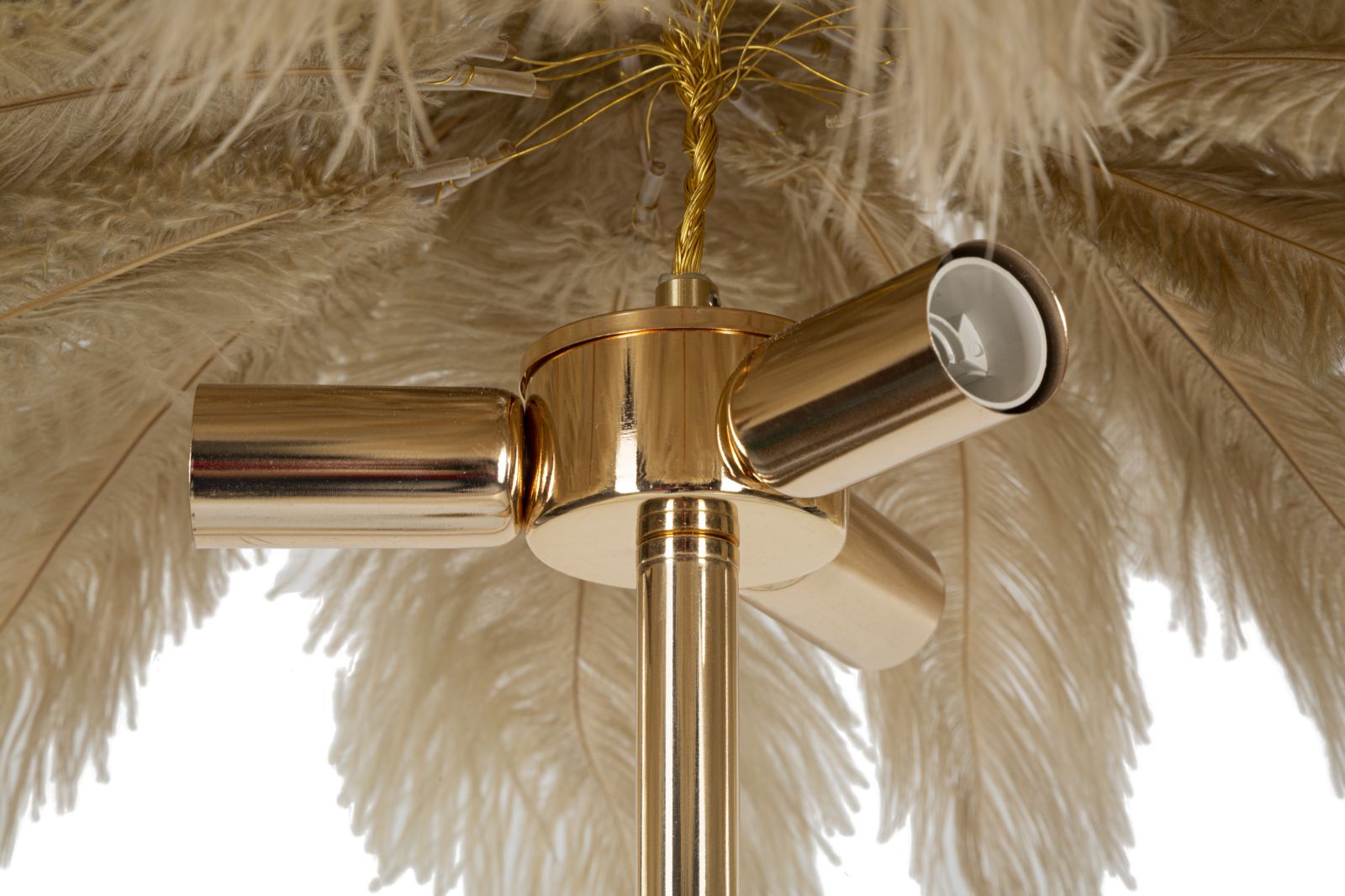 Piantana in metallo dorato con 3 punti luce e paralume composto da piume bianche.