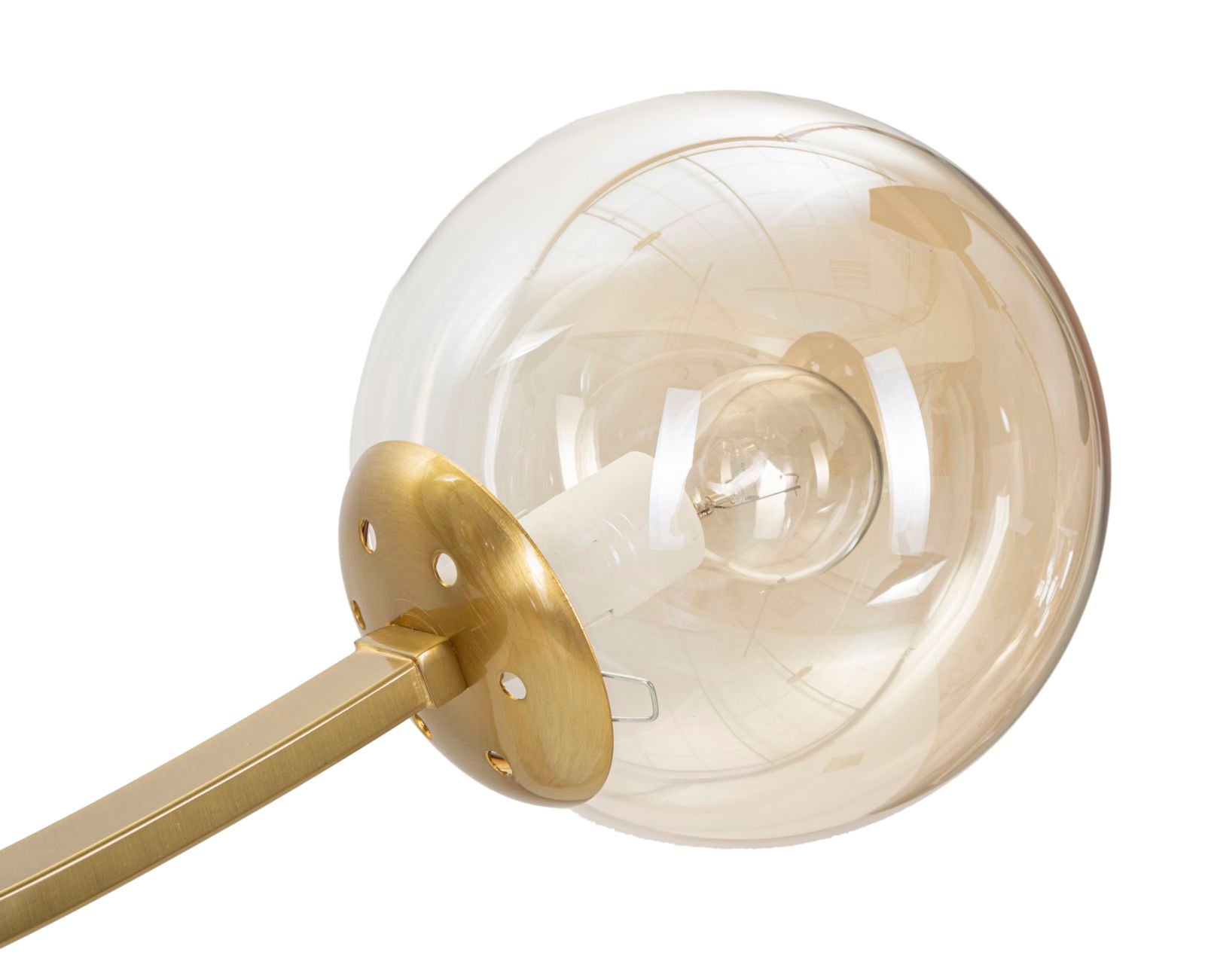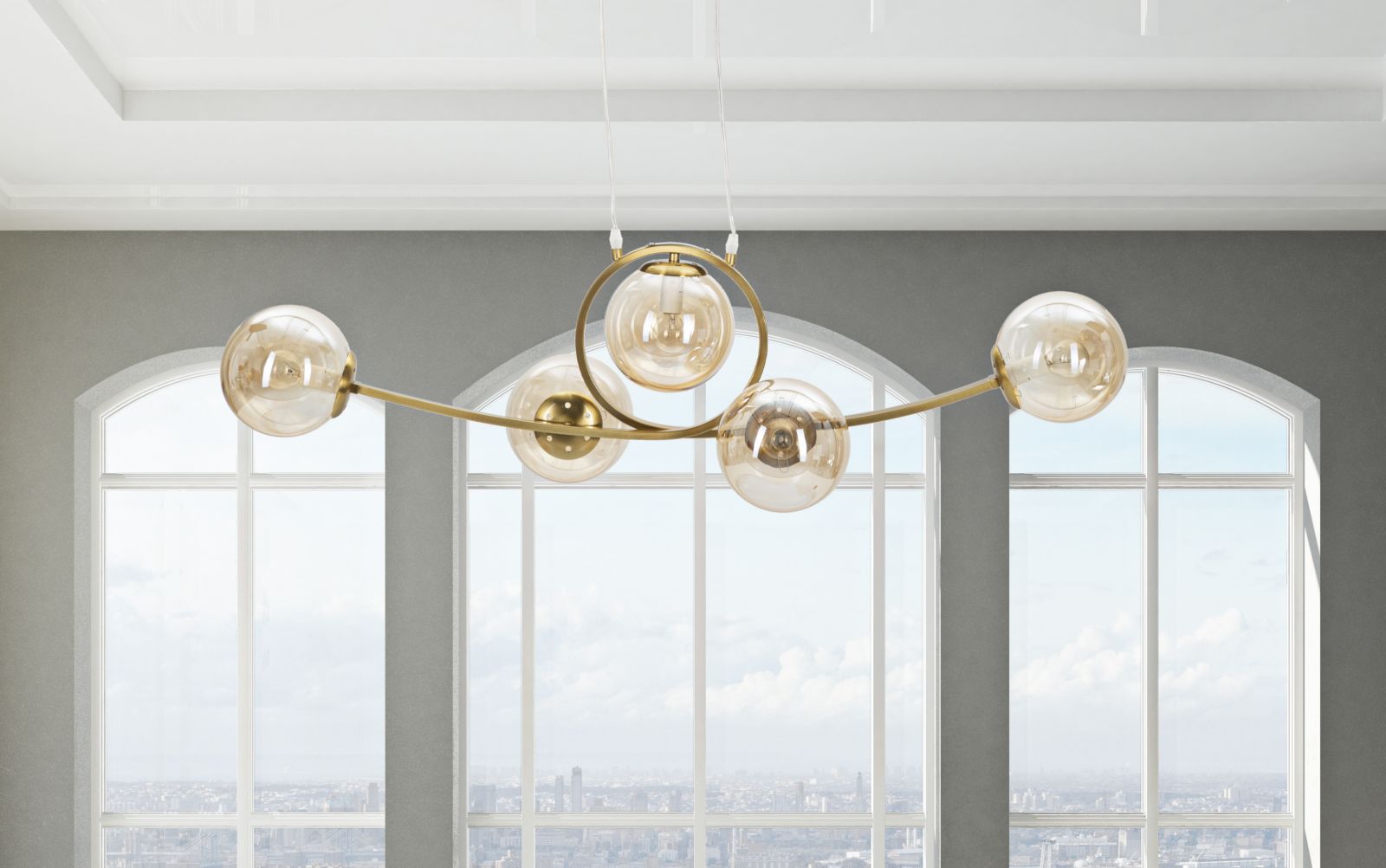 Lampadario in metallo dorato dalle linee essenziali con 5 punti luce in eleganti sfere di vetro bianco.